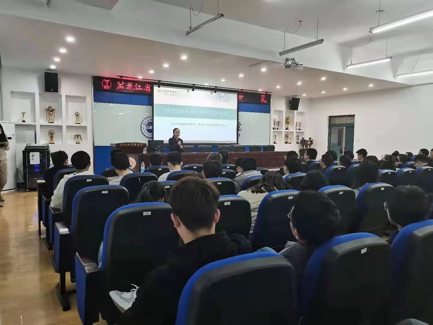 本次招聘会上,省农行人资部曾欢副总经理通过企业视频、招聘流程PPT展示,向在场的同学们,详细的介绍了农行的历史发展、规模、职业发展方向、招聘计划、培养机制以及福利待遇等等。中国农业银行黑龙江省分行是中国农业银行下属的一级分行,依托丰富的自然资源和振兴东北老工业基地机遇,紧密结合城乡经济的协同发展,秉承“以市场为导向,以客户为中心,以效益为目标”的经营理念,诚信立业,科学发展,经营业绩和同业竞争力大幅提升。本次招聘岗位共招177人,涉及四个岗位,包括:本部网络金融产品研发岗、本部业务管理岗、信息科技岗和通用业务岗。为前来应聘的同学提供了充足的选择机会。