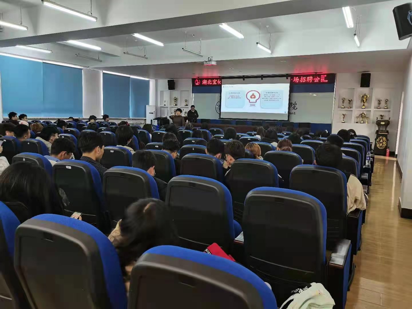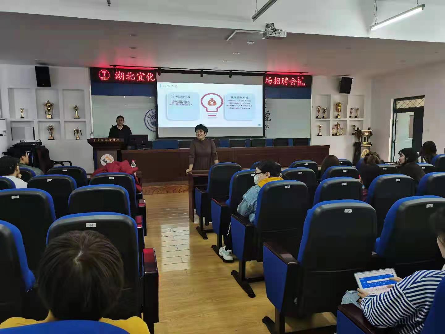 本次招聘会首先由该公司招聘工作负责人以PPT形式展开详细的介绍公司的发展概况、企业文化、工作岗位以及薪酬福利待遇等。