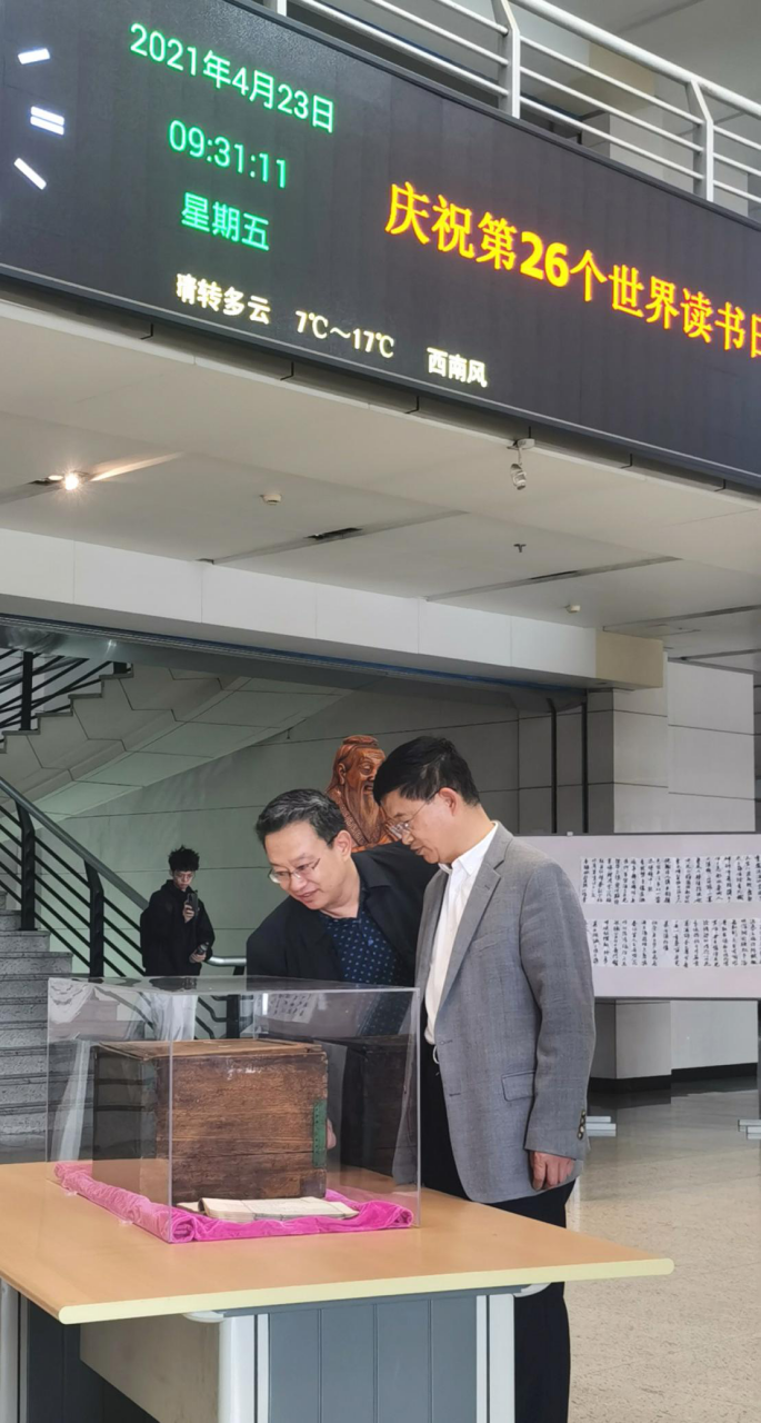 4月23日上午九点,副校长房文斌出席了“读书日”现场活动,观看了展出的古籍,为“世界读书日”当天系列活动拉开了序幕。