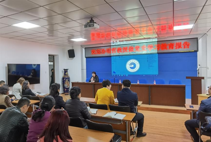 院党委书记张桂玲老师上台为本次会议致辞,随后孙明哲教授上台通过引用习近平总书记的讲话提出了本次报告的三个主要内容:“社会的发展是人类文明的进步”,“中国共产党成立的历史必然性”,“马克思主义指导思想的历史必然性”,并从这三个主要方面为大家带来了学习报告。