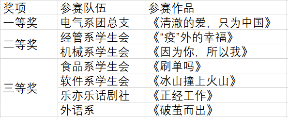 电气工程系《清澈的爱,只为中国》以一个小家庭的经历反映了守卫边疆战士们的梦想与坚守,为了国家,为了人民,死守祖国的边界线。经济管理系《“疫”外的幸福》通过演绎一个女大学生感染新冠病毒的经历,讲述了疫情期间医务工作者的辛苦、患者康复期间的心路历程,鼓励人们积极乐观面对疫情期间的生活。外语系《破茧而出》以一个小男孩的自白和回忆,展现了现代青年人对于生活的种种迷茫和困惑,最后通过朋友和亲人,逐渐感受到世界的美好,走出心理的困扰。食品工程系《刷单吗,同学?》讲述了一个大学生因为恋爱开销增大而被骗子利用,通过不正规渠道进行刷单被骗钱的故事。作品交代了现在一些不法分子骗钱的套路和方法,希望引起大学生们的警醒。软件工程系《冰山撞上火山》以一对小情侣间的矛盾为主线,告诉我们人的性格有很多种,其中热情和沉默就像两个对立面。而人与人之间的谅解会让青春更加美好。乐亦乐话剧社《正经工作》反映了现在很多大学生找兼职工作被“套路”等现状,告诫我们要保护好自己,不给不法分子可乘之机。机械工程系《因为你,所以我》以“灵魂穿越”的方式贯穿全剧,让自己看到了自己的缺点和不足并积极地改变,不让悲剧再次重演。