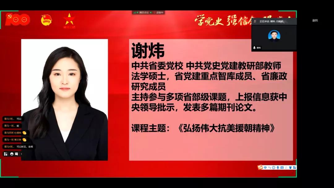 最后,副班主任吕懿超老师对谢炜老师的讲座进行了总结,同时强调青马培训班学员要认真学习历史,并要将伟大的抗美援朝精神落实于自己的实践之中,坚定跟党走中国特色社会主义道路的信念,成长为中国特色社会主义事业的合格建设者和可靠接班人。
