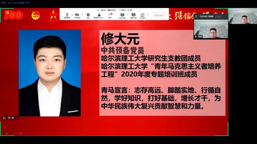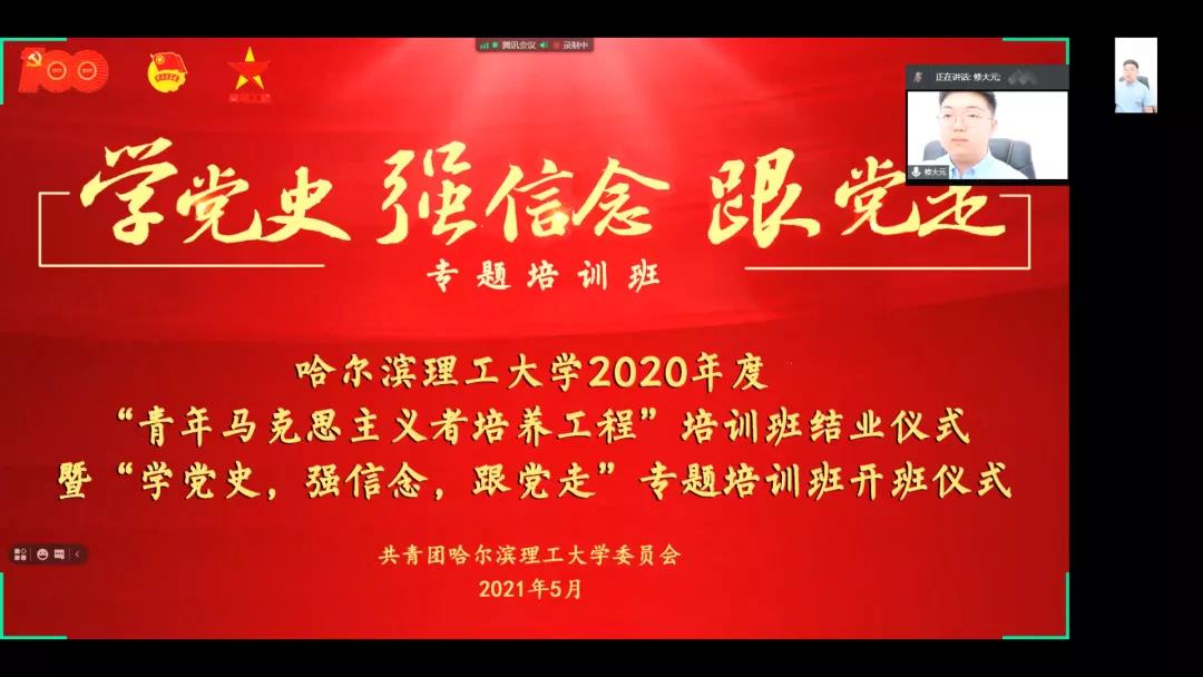 为引导青年学生进一步坚定理想信念,全面提升大学生骨干的综合素质,永利官网团委积极响应团中央、团省委和学校党委的号召,以建党100年为契机,以加深学员对党史的了解与认识,学深悟透习近平新时代中国特色社会主义思想,掌握马克思主义的思想方法和工作方法,进一步坚定跟党走中国特色社会主义道路的信心和决心为出发点,按照疫情防控要求,于2021年5月21日(星期六)17时借助腾讯会议app线上召开了77779193永利官网2020年度“青年马克思主义者培养工程”培训班结业式暨“学党史,强信念,跟党走”专题培训班开班仪式。2020年度“青马工程”培训班优秀学员代表、“学党史、强信念、跟党走”专题培训班学员及校青年发展规划中心工作人员等近150人参加本次活动,仪式由本次“青马工程”专题培训班副班主任吕懿超老师主持。