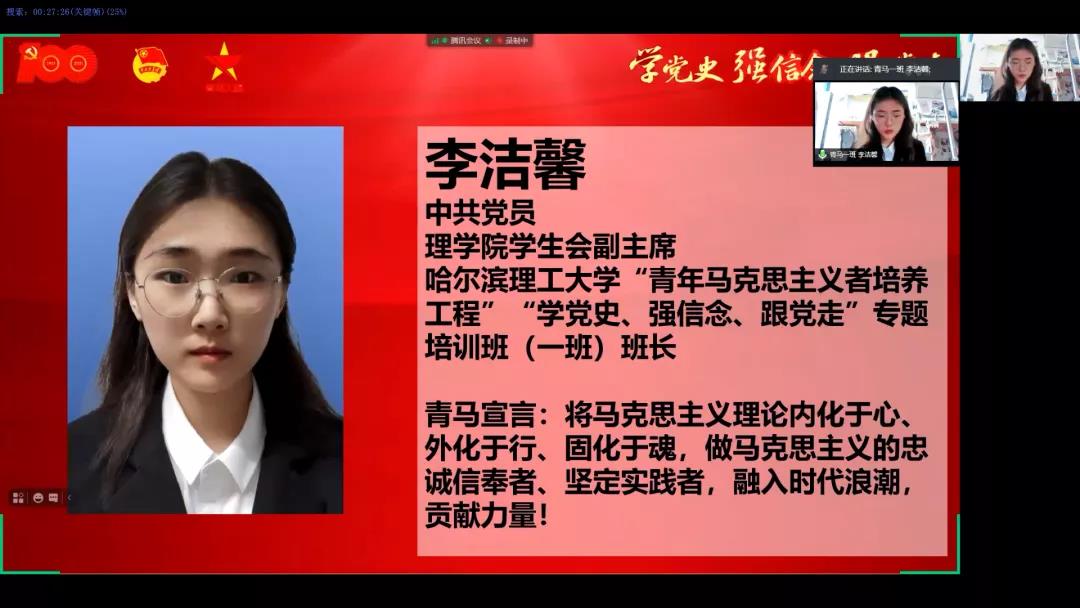 随后理学院学生会副主席李洁鑫作为本期“学党史、强信念、跟党走”专题培训班新生代表进行发言,她表明可以入选“青马工程”培训班是光荣的也是意义重大的,“青马工程”为学生骨干提供了理论学习、实践提高和相互交流的平台,希望能借助这个平台同有着共同追求的各位学员一同努力学习、共同进步,不断提升自己,不虚此行!