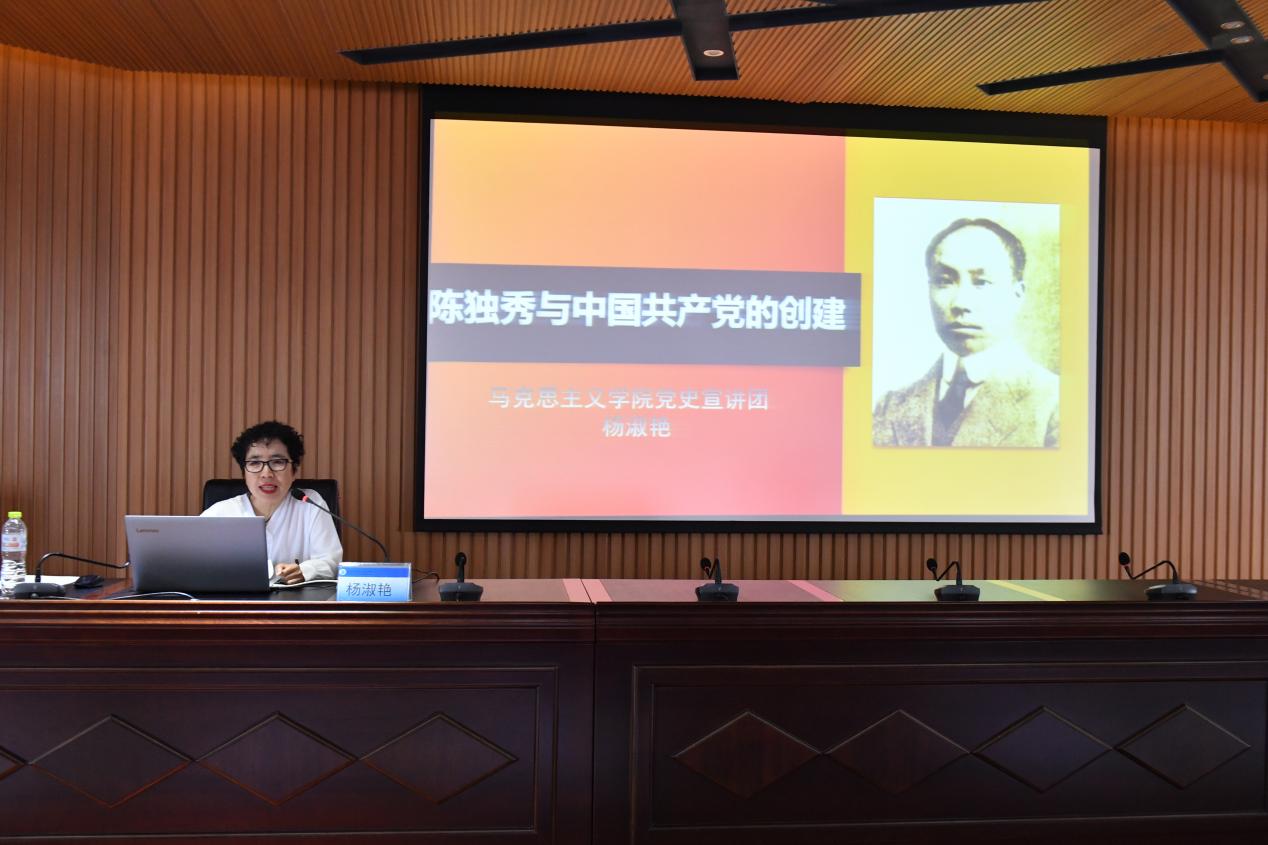 杨淑艳教授的报告从新文化运动的旗手、五四运动的总司令、中国共产党的重要创始人、沧桑百年再论功过四个方面,通过文字、视频等形式多方面多角度深刻阐释了陈独秀对推动中国历史前进和中国共产党创建做出过的重要贡献。本次党史宣讲报告会主题鲜明,内涵丰富,使大家对中国革命史,对陈独秀等为中国共产党创建有过重要贡献的先驱者有了更为全面的认识,对中国共产党百年奋斗的光辉历程和开展党史学习教育的重大意义有了更加深刻的理解。