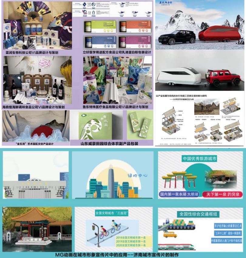 其中,视觉传达专业毕业生为荣成康派斯新能源车辆股份有限公司设计的拖挂式房车内外装饰方案、为荣成金石湾艺术园区设计的文创衍生品、为荣成蓝润生物科技有限公司、威海鲁东特殊医学用途配方食品公司、荣成海的故事(海鼎煌)调味食品有限公司设计的VI系统以及为山东立好特殊医学用途配方食品有限公司、山东威豪田园综合体发展有限公司设计的包装作品都受到企业的采纳和好评,体现出应用与务实精神。动画专业毕业生创作的济南城市宣传片生动地展现了济南的城市面貌和著名景区景点。环境设计专业毕业生的海草房民居设计展现出将本地海洋民俗文化和现代家居情调相互融合的创新精神。还有很多作品是基于国画书法、戏剧、皮影、剪纸等中国传统文化及民族工艺元素进行创作而来,彰显出文化自信。