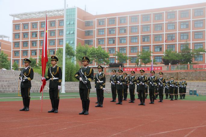 国旗护卫队24名学生,身着崭新的服装踏着坚定的步伐走向升旗台,全体肃立,升国旗奏国歌。