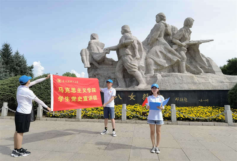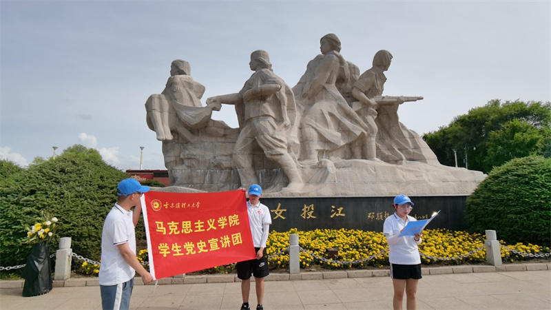铭记历史,激励当下,昭示未来。为了将实践所听、所学、所思、所感向更多的青年学生进行宣传,使更多学生了解八女投江殉国英勇牺牲的事迹,弘扬传承抗联精神,马克思主义学生党史宣讲团成员董敏、姜学伟在纪念雕像前开展主题宣讲。