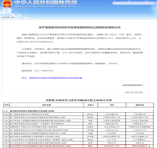 日前,根据《教育部办公厅关于推荐新文科研究与改革实践项目的通知》(教高厅函〔2021〕10号)要求,经单位推荐、网络审核、会议审议等程序,公布首批新文科研究与改革实践项目立项名单。永利官网经济与管理学院魏玲教授主持的“新文科背景下经管类课程数字化融合创新教学模式的研究与实践”成功获批。该项目是永利官网获批的第一项国家级新文科教学改革项目,实现了零的突破。同时,学院李继承教授主持的“数字经济时代理工科院校工商管理类专业新文科课程体系建设与实践”获批省级新文科研究与改革实践一般项目。