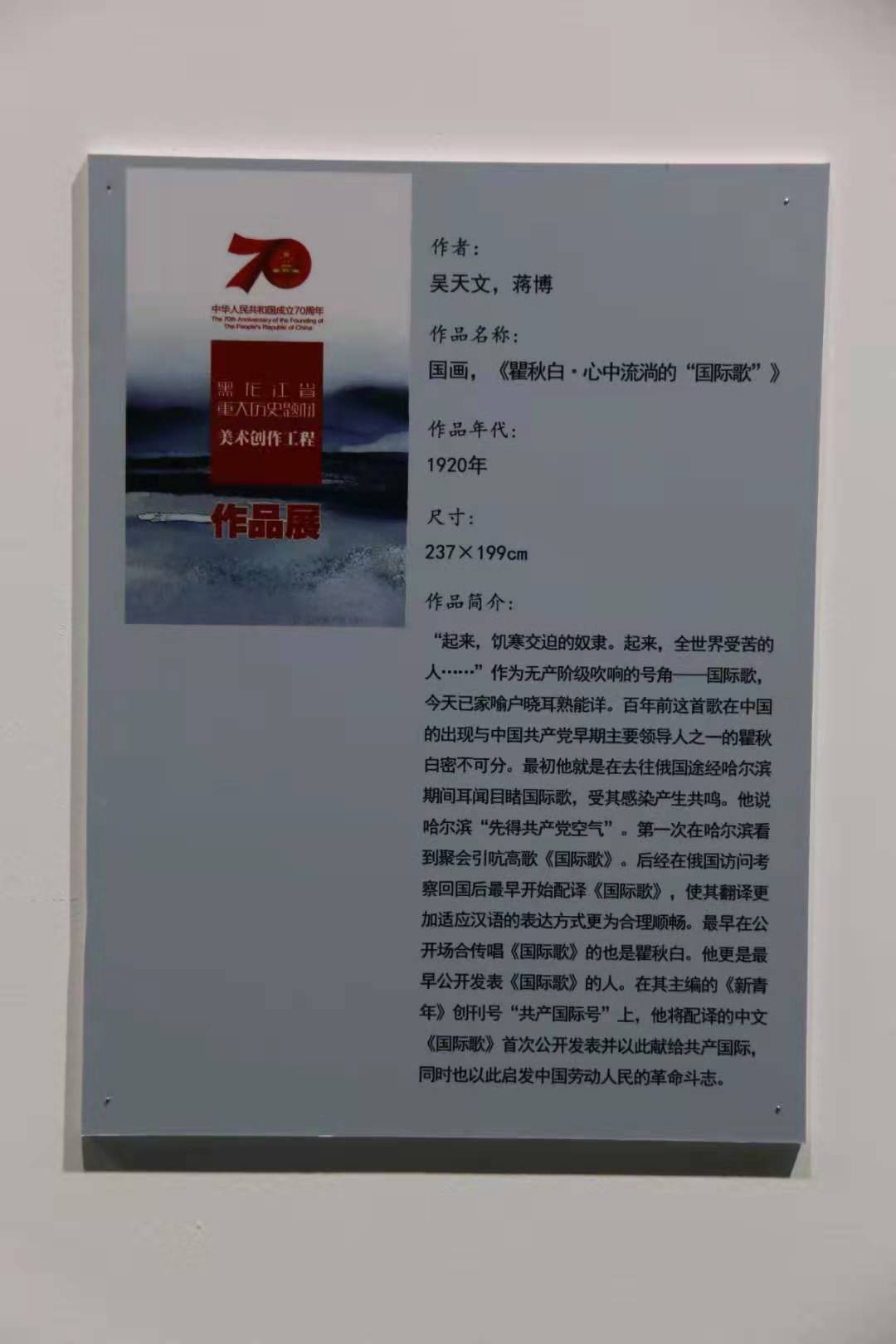 为庆祝建党百年美术展览在我省哈药美术馆拉开帷幕,作为省委庆祝建党百年的重点活动之一,此展精选出的艺术作品描绘了在党的领导下黑龙江各个历史时期的重大事件、典型人物和新时代新生活,书写了中国共产党人的理想信念和初心使命。其中“民族脊梁”板块中,《瞿秋白——心中流淌的国际歌》这幅作品作为第一幅作品展出。