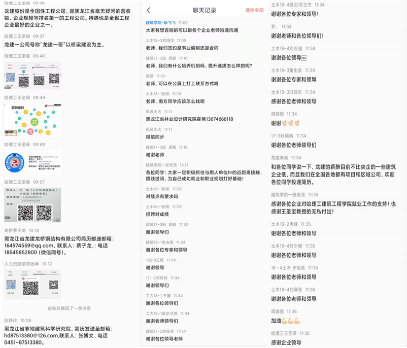 接下来,各企业单位按照会序依次进行宣讲,首先进行云宣讲的是龙建集团及其所属企业:龙建路桥股份有限公司、龙建路桥第一工程有限公司、龙建路桥第六工程有限公司、龙建路桥股份有限公司铁路建设分公司、龙建龙桥钢结构有限公司5家单位分别详细说明了各个公司的概况、发展历程、产业方向以及人才需求,向同学们宣讲了龙建集团是立足于黑龙江的大型国有建筑企业,欢迎各位同学前来参观和工作。随后进行云宣讲的是黑龙江省寒地建筑科学研究院及所属企业,黑龙江省寒地建筑科学研究院、工程材料研究所、冻土工程与冬期施工技术研究所、建设工程技术标准中心、黑龙江省建研建筑能耗检测中心、工程结构研究所6家单位分别介绍了自身研究方向,鼓励同学们以所学专业为基础,在研究院内进行更深层次的研究与学习。最后进行云宣讲的是黑龙江省林业设计研究院,黑龙江省林业设计研究院是资质全面的研究院,具有特色科研方向,并且与华为等大型国有企业共同参与设计多项大型科学研究项目。宣讲结束后是毕业生与企业互动问答环节,各专业毕业生踊跃提问,针对感兴趣的各企业提出了有关招聘专业、薪资待遇、工作岗位以及工作地点等系列问题,与会企业一一耐心解答,并表示欢迎广大理工学子积极向各单位投递简历。