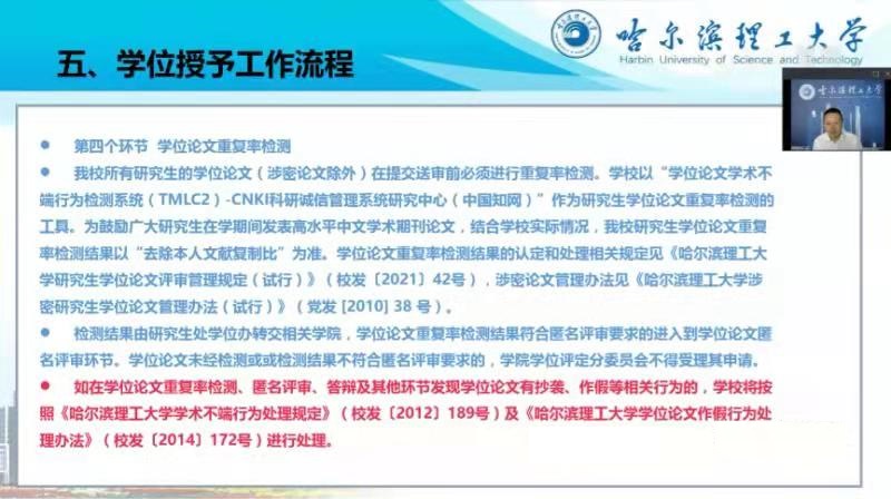 颜廷亮副处长向2021级博、硕士研究生表示欢迎和祝贺,介绍了学校研究生校院二级管理的职能分工。研招办陈峰老师、学籍办贾冬雪老师、培养办吴越老师和学位办刘万涛老师就负责工作进行了详细讲解。从入学须知到学位授予,从工作流程到关键环节,近两个小时宣讲会受到同学们的广泛关注和认可。