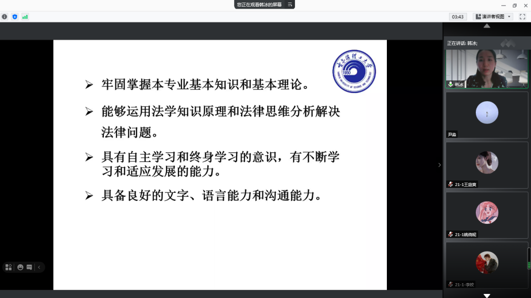 法律系韩冰老师从法学专业的学科建设、培养目标及要求、课程建设、师资队伍进行详细陈述,围绕法学基本内容、发展前景以及本专业的学科优势做了详细的讲解,向大家提出了在专业学习时的要求和建议。加深了同学们对法学专业的认知。她鼓励同学们能够积极参与实践教学,不断提高自身本领,轻松愉快度过大学美好的四年。