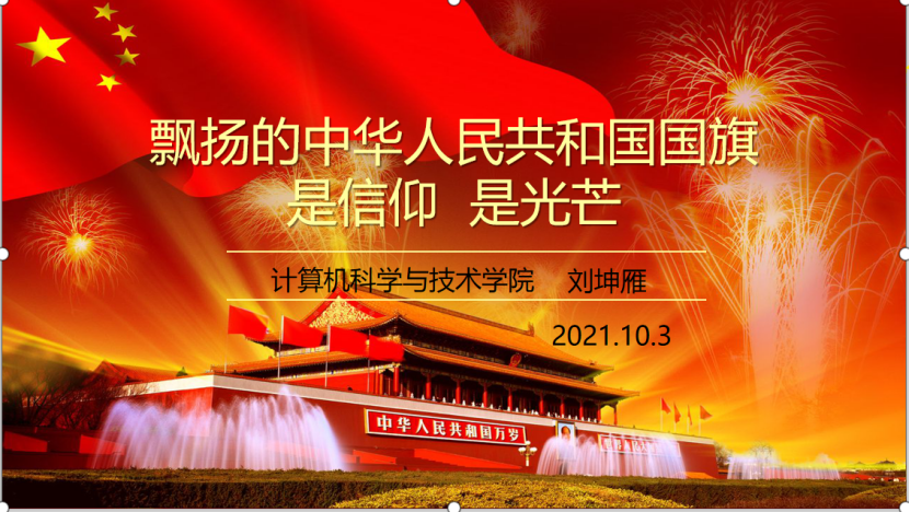 七十二年风雨兼程,七十二载缤纷年华。时值全国各族人民喜迎中华人民共和国成立72周年之际,为热烈庆祝祖国华诞,增强学院全体同学民族自豪感和凝聚力,巩固党史学习教育成效,同时进一步做好疫情常态化学校防疫工作,计算机学院于2021年10月3日面向全院本、 硕、博学生开展了主题为“强国有我、共抗疫情”的国庆第一课。本次课程采用线上方式进行,全课程分为四个主题,分别是疫情防控形势要求、个人防护能力知识、心理健康教育疏导、国庆主题思政教育。其中国庆主题思政教育课2次,疫情防控形势要求课4次,个人防护能力知识课4次,心理健康教育疏导课1次。