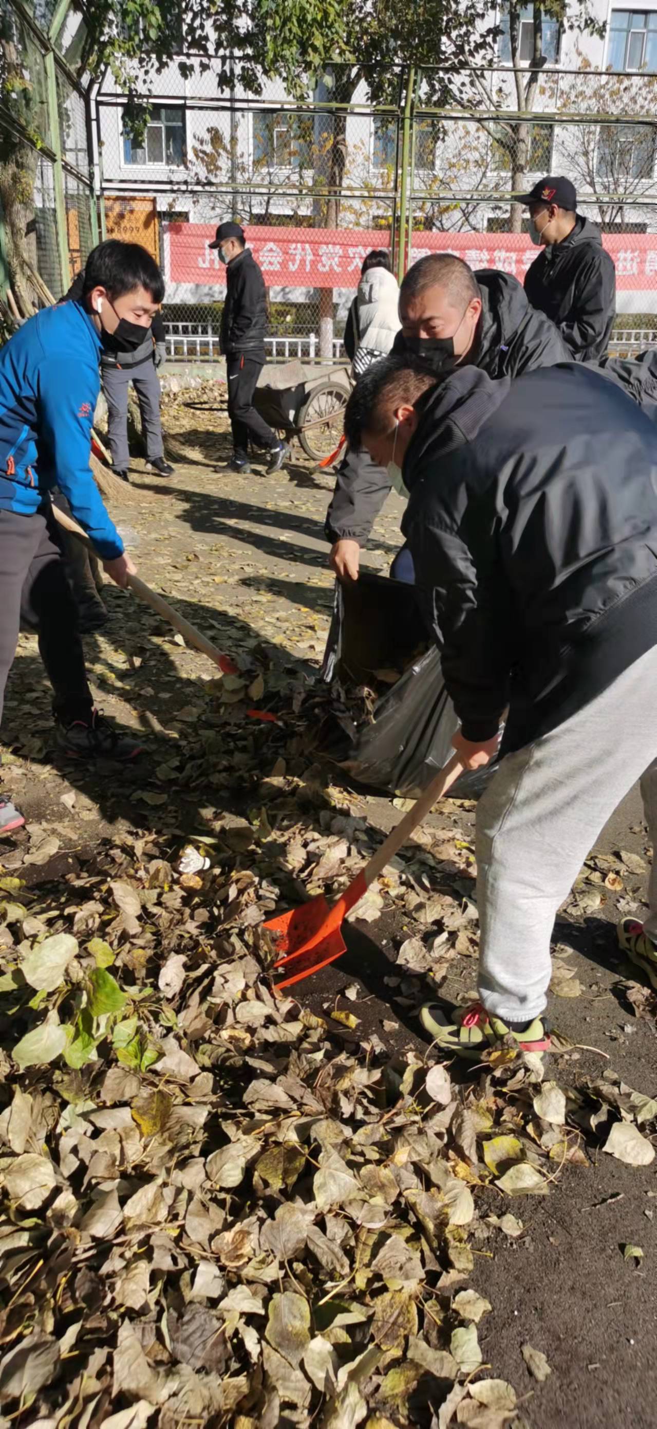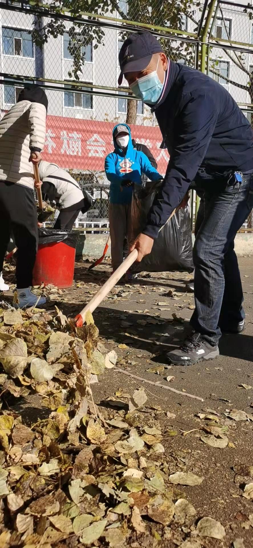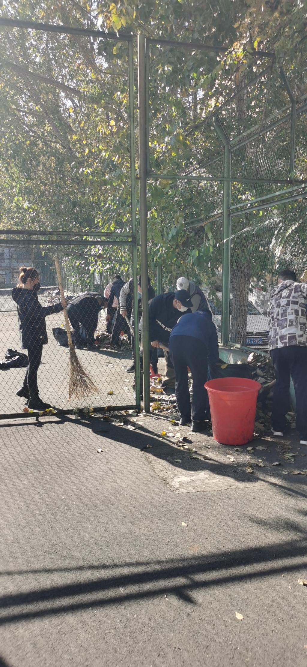 在全国上下庆祝建党100周年和建国72周年,在全校师生刚刚取得抗击疫情新一轮胜利之际,时至深秋,纷纷扬扬的落叶随风飘落洒满了整个运动场,对校园的美观整洁和全校师生的体育锻炼都造成了一定的影响。今天上午,体育教学部党支部根据学校党委党史学习教育要求,结合部门实际开展了一次以“我为群众办实事”为主题的义务劳动。发动全体党员同志,利用课余时间,清扫西区网球场的落叶和各种杂物。活动中,大家分工合作,手持扫帚、铁锹、垃圾袋、小推车等工具,将网球场地面的落叶、枯枝和垃圾悉数清理干净,并将清扫出来的垃圾统一收集、清运、集中处置。
