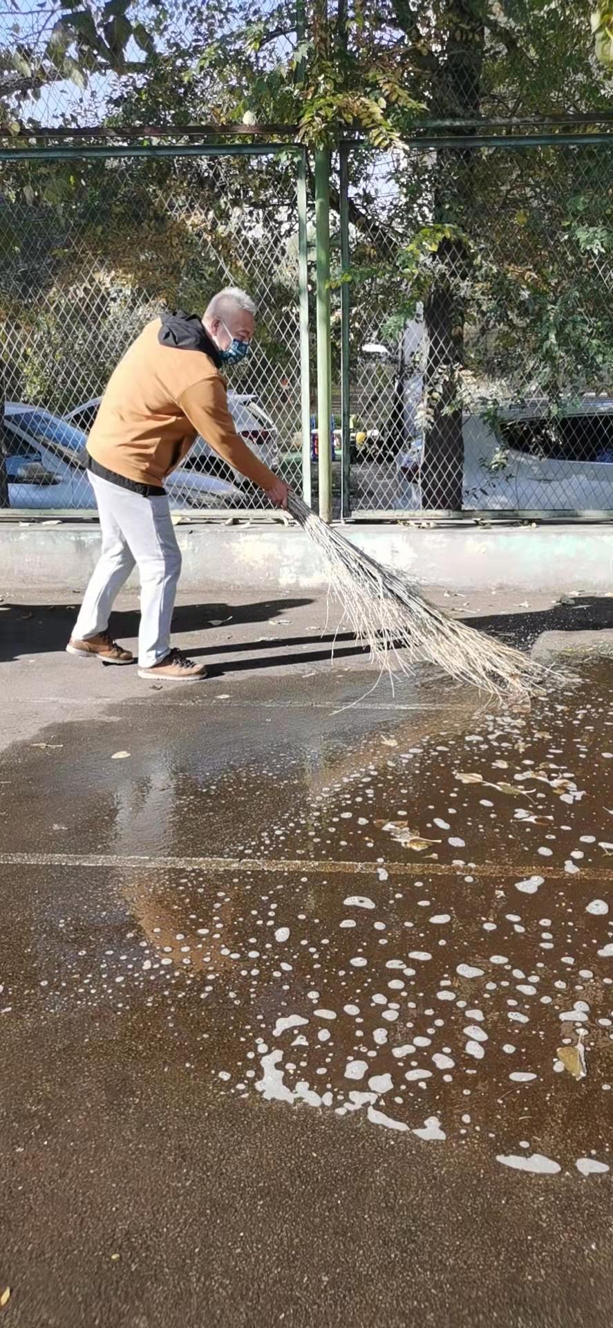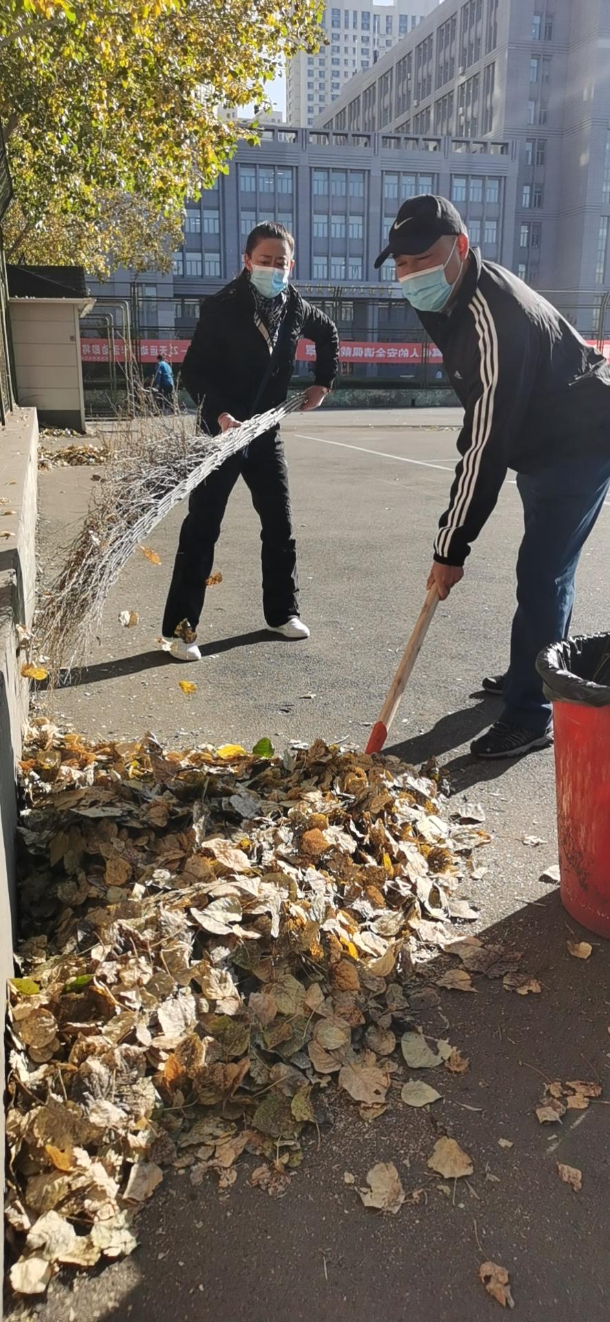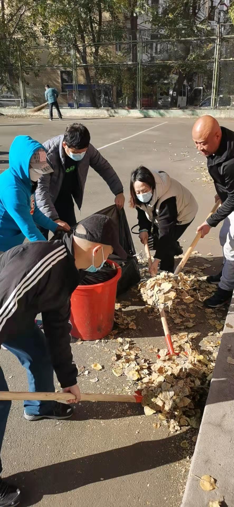 在全国上下庆祝建党100周年和建国72周年,在全校师生刚刚取得抗击疫情新一轮胜利之际,时至深秋,纷纷扬扬的落叶随风飘落洒满了整个运动场,对校园的美观整洁和全校师生的体育锻炼都造成了一定的影响。今天上午,体育教学部党支部根据学校党委党史学习教育要求,结合部门实际开展了一次以“我为群众办实事”为主题的义务劳动。发动全体党员同志,利用课余时间,清扫西区网球场的落叶和各种杂物。活动中,大家分工合作,手持扫帚、铁锹、垃圾袋、小推车等工具,将网球场地面的落叶、枯枝和垃圾悉数清理干净,并将清扫出来的垃圾统一收集、清运、集中处置。