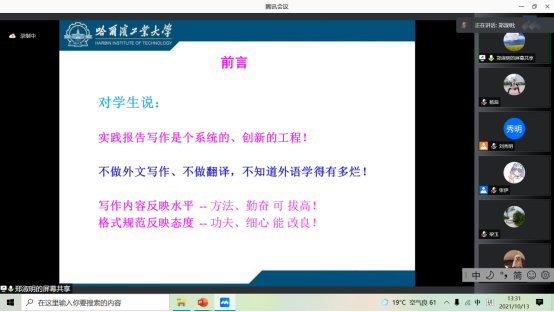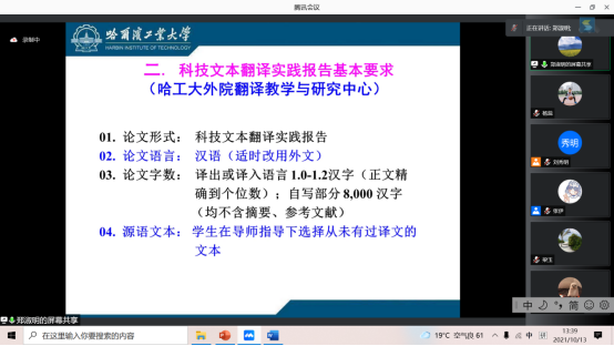 为深入贯彻落实全国研究生教育会议精神,提升导师队伍业务素质和指导水平,提高研究生人才培养质量,根据学校研究生指导教师培训工作安排,外国语学院翻译专业学位硕士(MTI)教育中心于10月13日13点如期举办2021年第二期教学讲座。中心邀请哈尔滨工业大学翻译教学与研究中心主任郑淑明教授做主题为《MTI科技文本翻译实践报告写作:问题与对策》的讲座。MTI教育中心副主任刘秀明教授、杨秋香教授、学院全体硕士研究生导师、研究生授课教师、在读研究生近100余人参加学习,外国语学院副院长杨蕊主持讲座。
