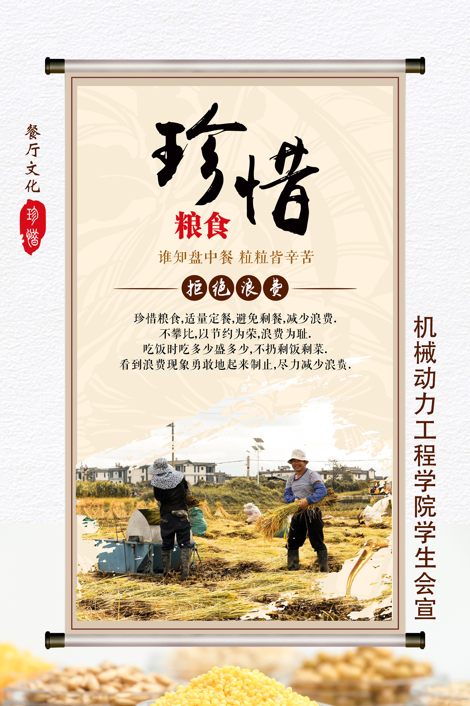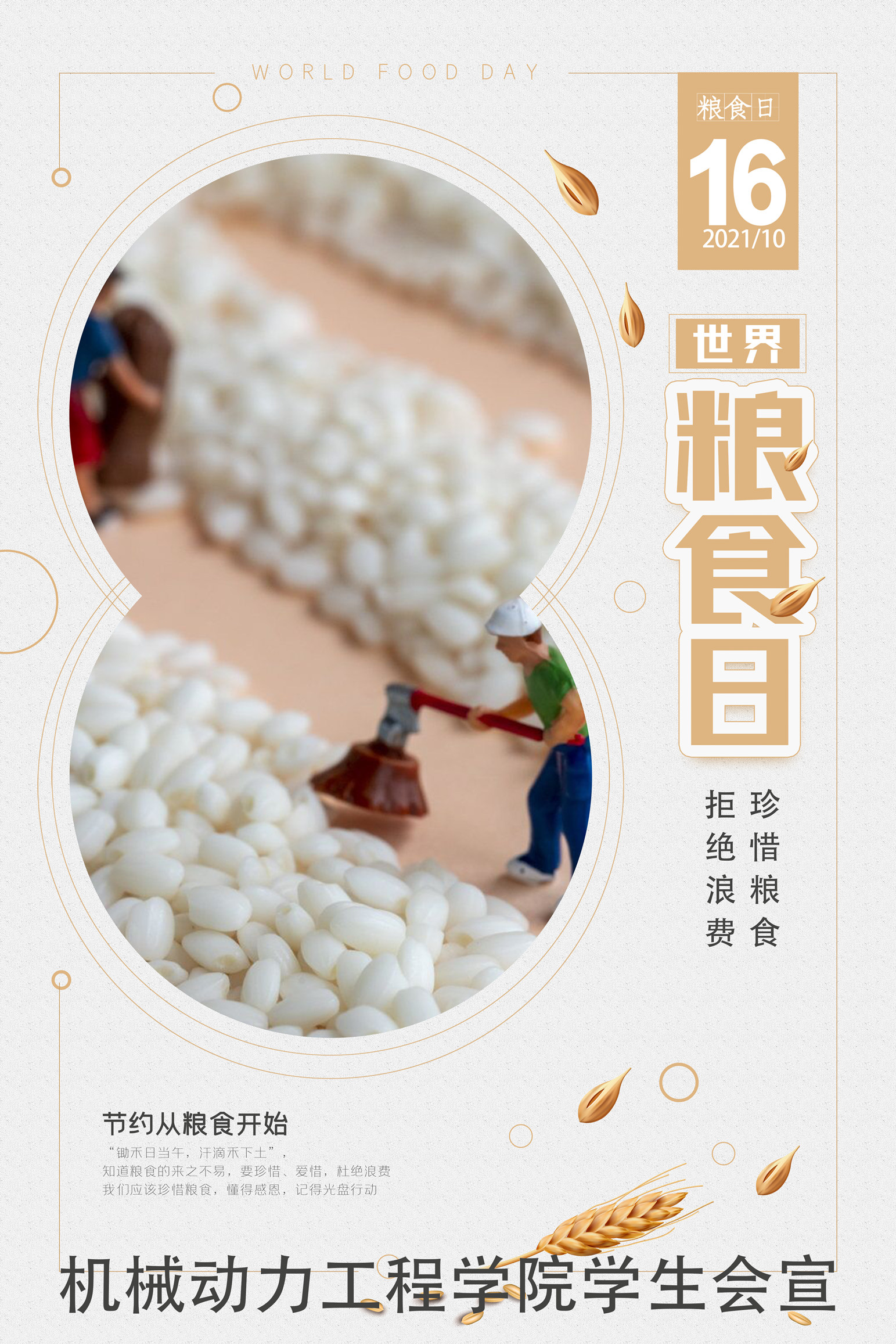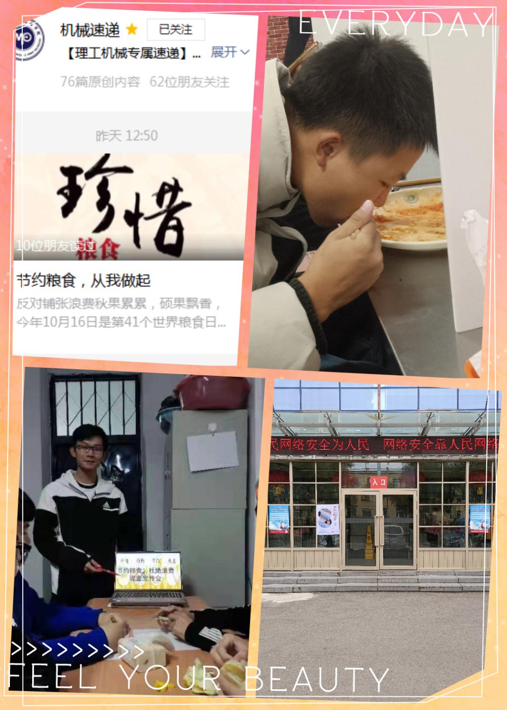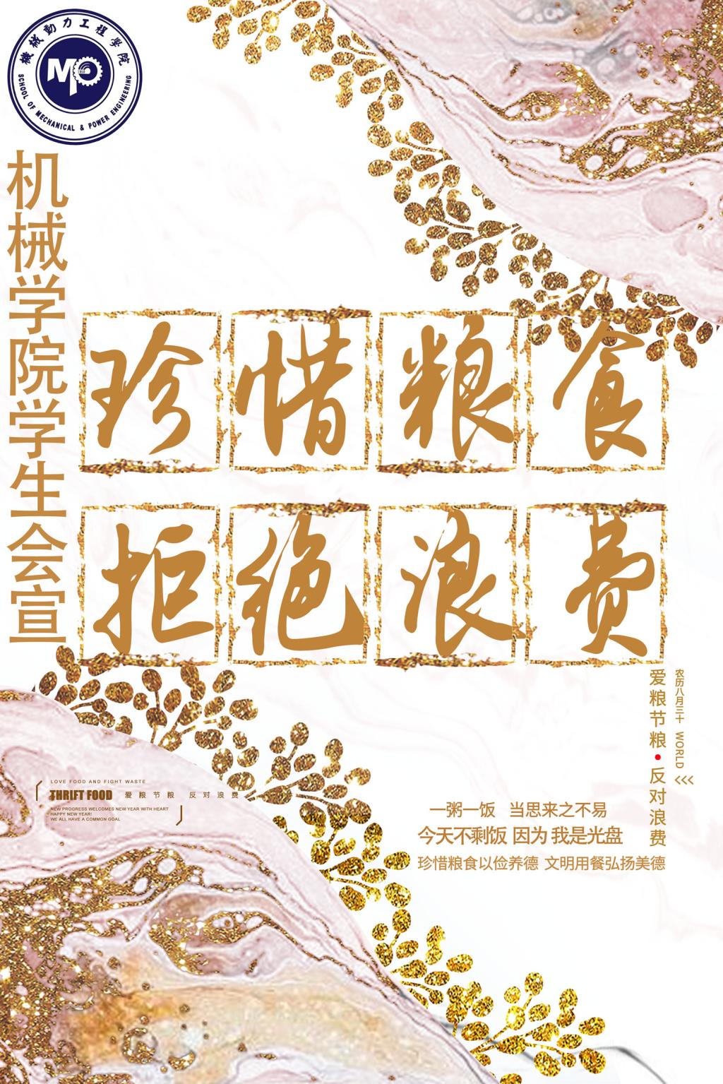 2021年10月16日是第41个世界粮食日,机械动力工程学院为响应学校“世界粮食日宣传活动”号召,着眼于让师生真正树立绿色消费、科学消费的意识,养成爱粮节粮,勤俭朴素的习惯,结合学院实际扎实开展了以下活动: