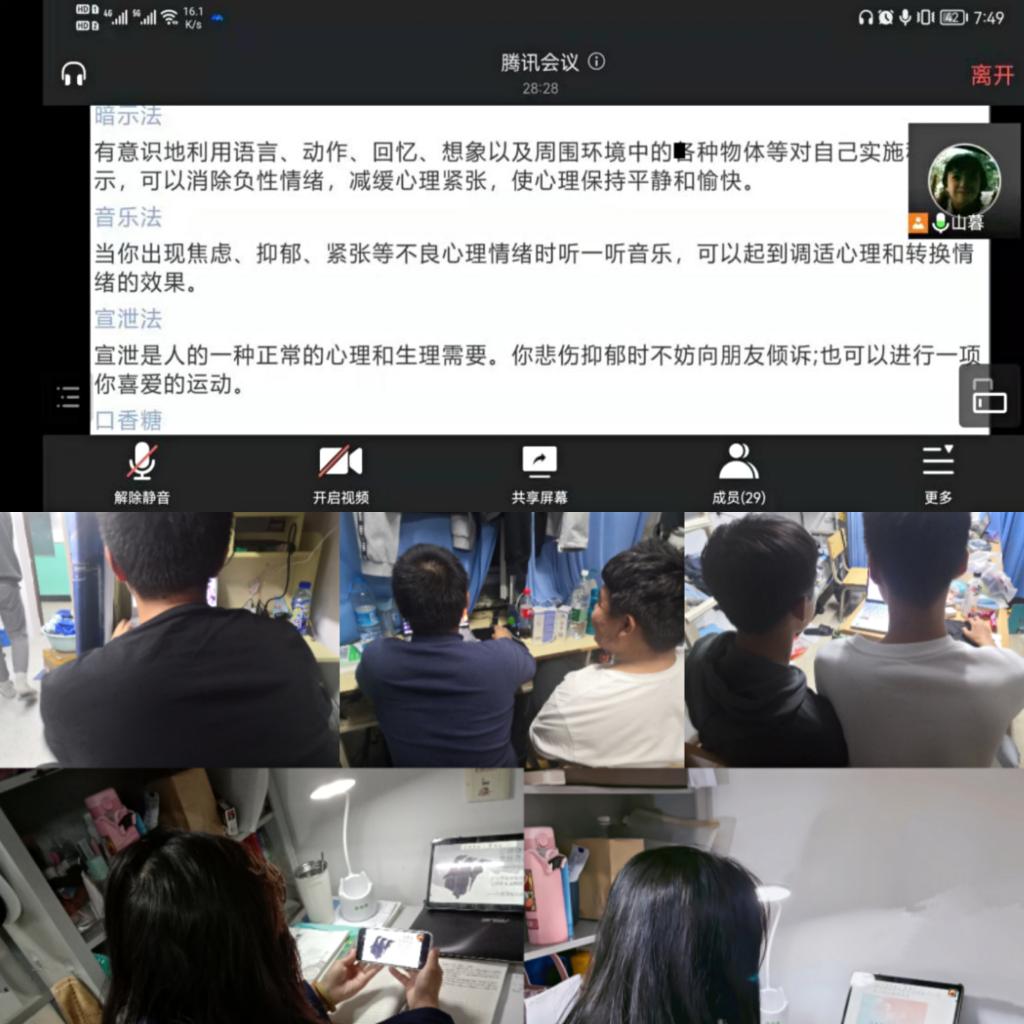 测通学院组织各班开展了“心理健康、激扬青春”线上主题班会。班会由辅导员、班主任和心理委员组织,对大学生心理问题进行了深入的探讨。班会中,组织者不仅带领同学们体验各种情绪、感知他人情绪,还引导同学们学会正确处理生活中的消极情绪,构建和谐的人际关系。本次主题班会同学们活跃度很高,开展之后反响极佳,对加强班级建设、增强学生心理保健意识具有积极的促进作用。