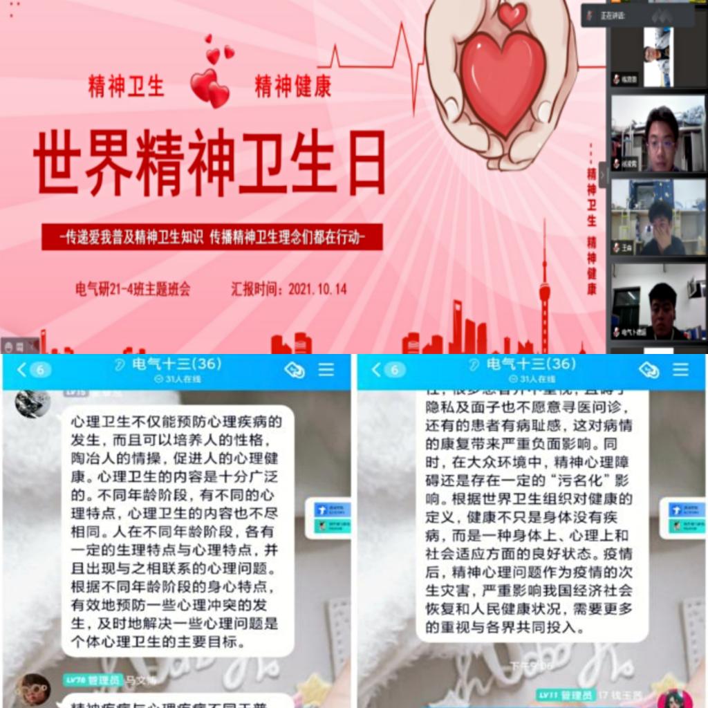 电气学院组织本科生和研究生开展了以“心理健康、激扬青春”为主题的班会。班会由辅导员老师牵头,心理委员积极策划实施。各班以主题讲座、QQ群或微信群讨论、视频会议等形式展开了热烈的交流和研讨。班会内容主要涵盖了“世界精神卫生日”的由来、精神疾病危害、常见心理问题等,并进行了心理健康小测试。此次主题班会中,同学们踊跃参与、积极发言,有效缓解了同学们在疫情期间的心理负担,提高了同学们对心理健康重要性和迫切性的认识。