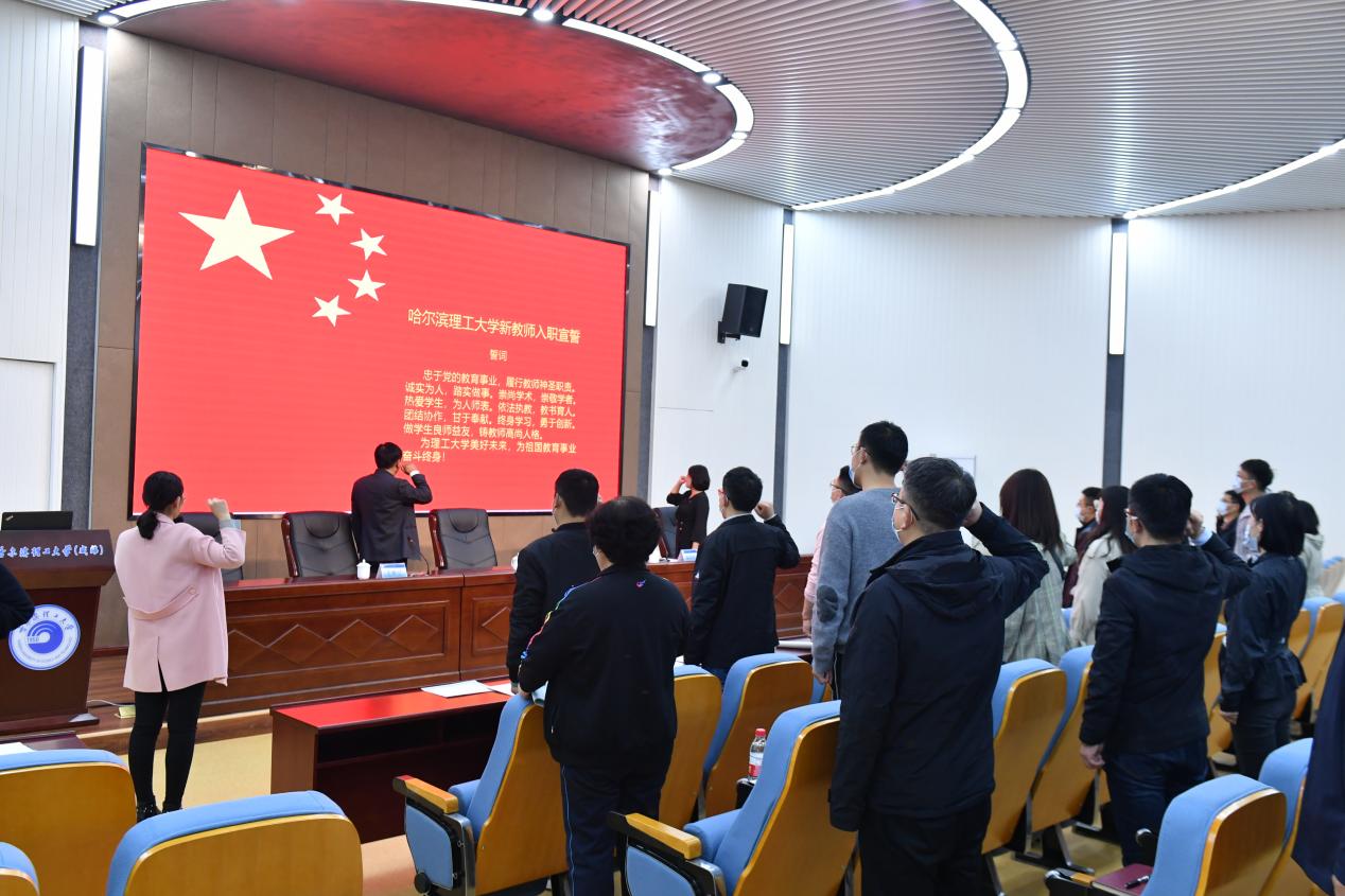 随后,新入职教师宣读入职誓词,老教师重温誓词。全体教师面向国旗,高举右拳,郑重宣誓,做出对教育事业的庄严承诺:“忠于党的教育事业,履行教师神圣职责。诚实为人,踏实做事。崇尚学术,崇敬学者。热爱学生,为人师表。依法执教,教书育人。团结协作,甘于奉献。终身学习,勇于创新。做学生良师益友,铸教师高尚人格。为理工大学美好未来,为祖国教育事业奋斗终生!”。