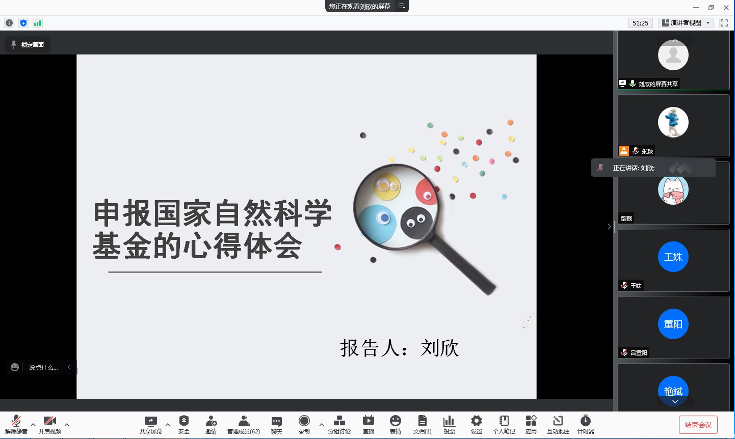 金辛副院长以《国家自然科学基金项目申请过程中的几点思考》为题,宣讲了新形势下科学基金的总体目标、改革措施、评审机制和资助导向。通过详实的数据对比分析,细致介绍了近年来国家基金的申请接收情况、申请书质量情况、各学部资助比例等相关情况。结合自身多年的基金管理经验,金辛副院长从夯实研究基础、早谋划早行动、拓宽同行资源、多渠道专家把关等方面为与会师生进行了详尽的信息推送。刘欣老师分享了自己连续四年申请终于获得资助的收获和体会,她鼓励青年教师一定要扎实积累工作基础,认真撰写申请材料,积极参加项目研讨,踏实做好修改完善,这是获得基金资助的唯一途径。