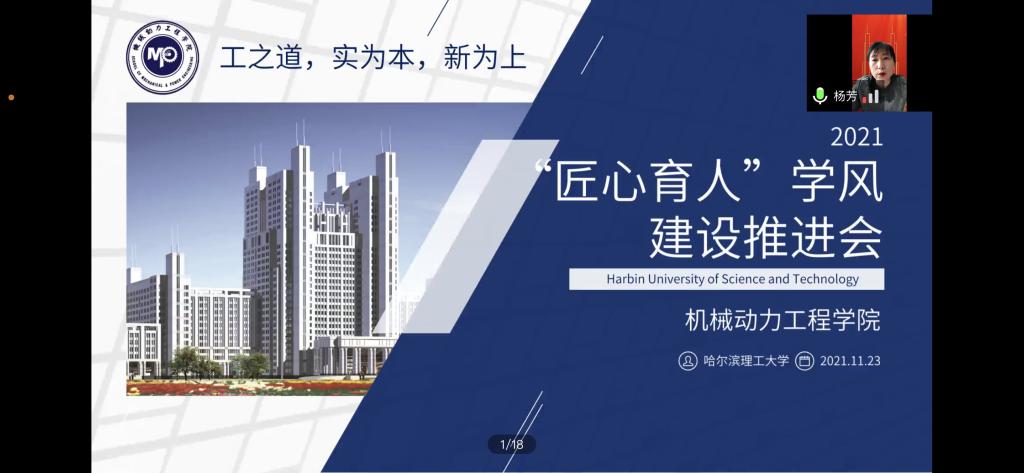 为贯彻落实党委学工部“勤学苦练、理工先锋”主题学风建设工作部署,扎实提升学院学风建设质量,构建学院学风建设长效机制,机械动力工程学院于11月23日召开了“‘匠心育人’学风建设系列活动线上推进会”。机械动力工程学院党委副书记杨芳、教学副院长姜金刚、学院全体学生工作队伍成员、21级新生班主任老师以及学院各社团组织学生骨干、各班级团支部成员共同参会,会议由杨芳副书记主持。