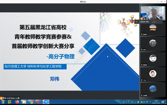 邓伟老师具有丰富的教学经验,是省级线上线下精品课程负责人,第五届黑龙江省青年教师教学竞赛工科组一等奖获得者,首届黑龙江省高校教师教学创新大赛暨首届全国高校教师教学创新大赛(龙江赛区)选拔赛副高组二等奖获得者。邓伟老师结合自己的参赛经验,从宏观和微观两个方面详细解读了参赛要求和评分标准,并以自己的教学案例为例,对课堂教学和教学设计等方面做了经验分享,对难点、重点、采分点等做了重点介绍,通过参赛经历提醒参赛教师注意事项。此次教学竞赛培训会受到我院青年教师极大关注,会后青年教师与邓伟老师进行了线上交流。