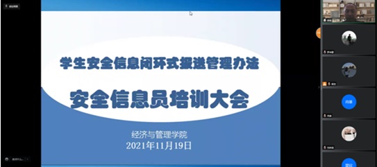 为提高经济与管理学院学生安全防范意识和安全预警能力,进一步加强学院安全稳定信息员队伍建设,贯彻落实校党委学工部《关于开展学生安全稳定信息闭环报送相关工作的通知》要求,11月13至21日,学院以年级专业为单位由辅导员老师召开了线上安全稳定信息员培训大会,学院党委副书记徐岩带头为96名研究生安全稳定信息员进行了学习培训,全体辅导员为500余名本科学生干部、党员、安全稳定信息员进行了学习培训。