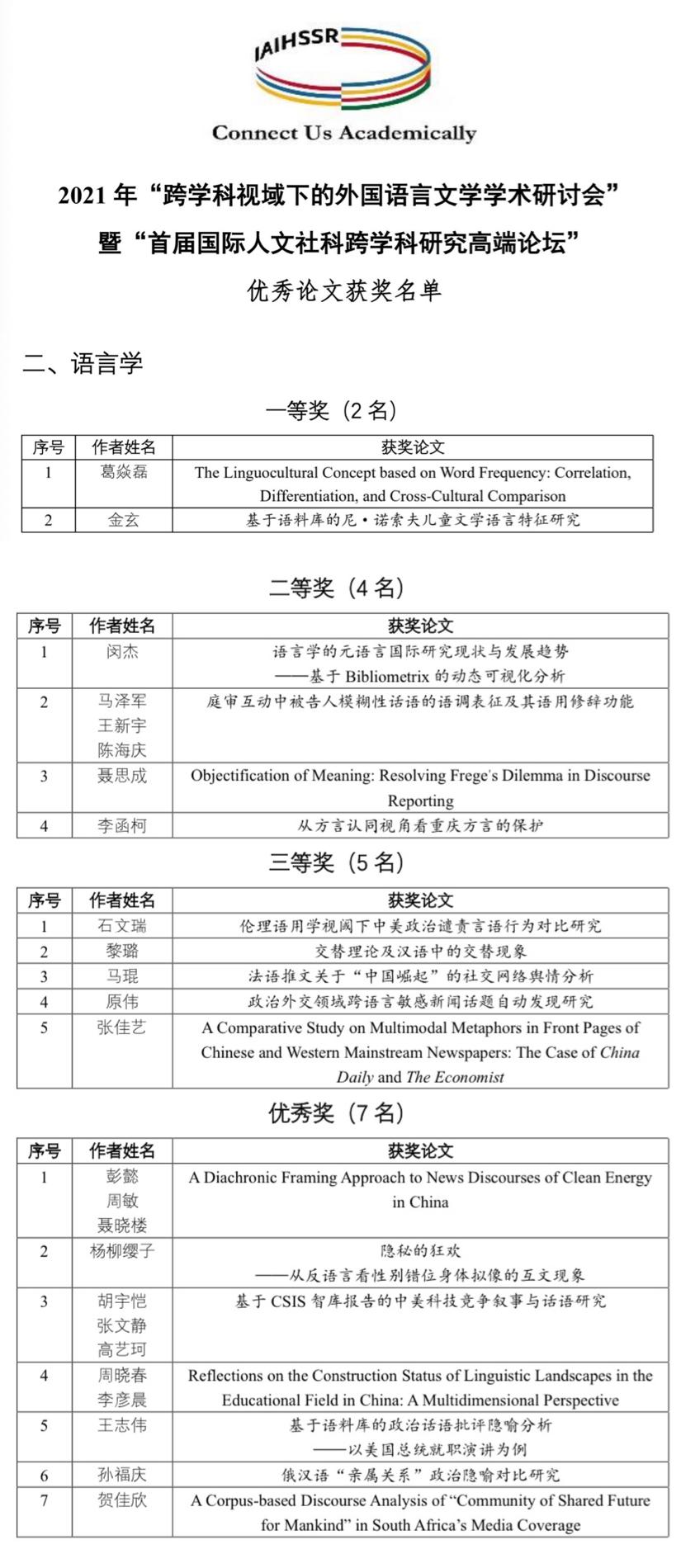 2021年“跨学科视域下的外国语言文学学术研讨会”暨“首届国际人文社科跨学科研究高端论坛”于11月26日-28日在网络云端成功举办。外国语学院俄语语言文学硕士研究生金玄同学喜获“优秀论文”一等奖。