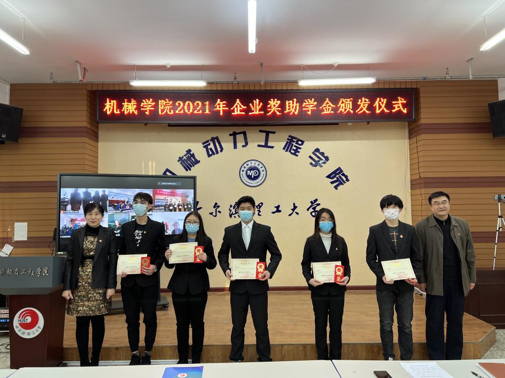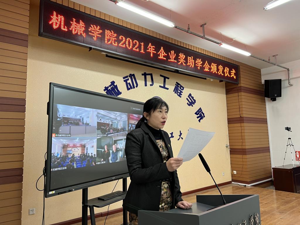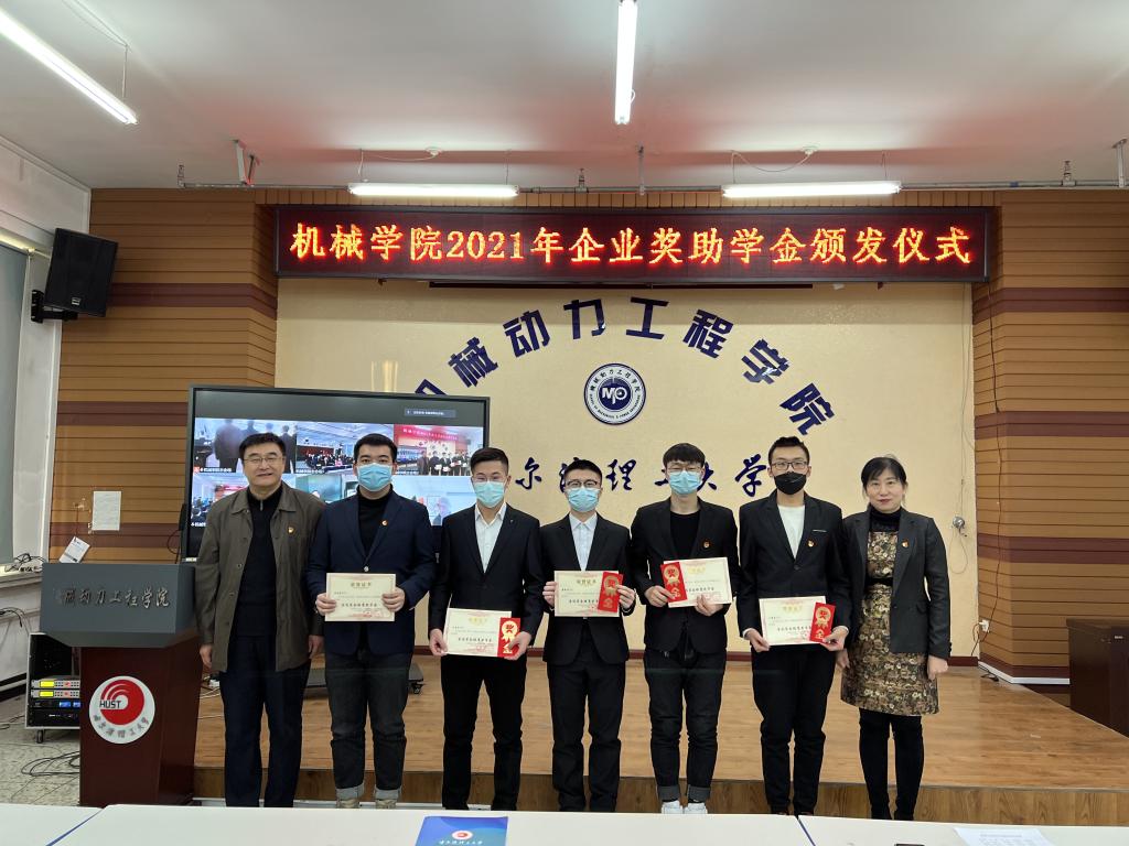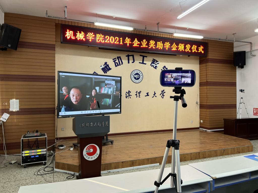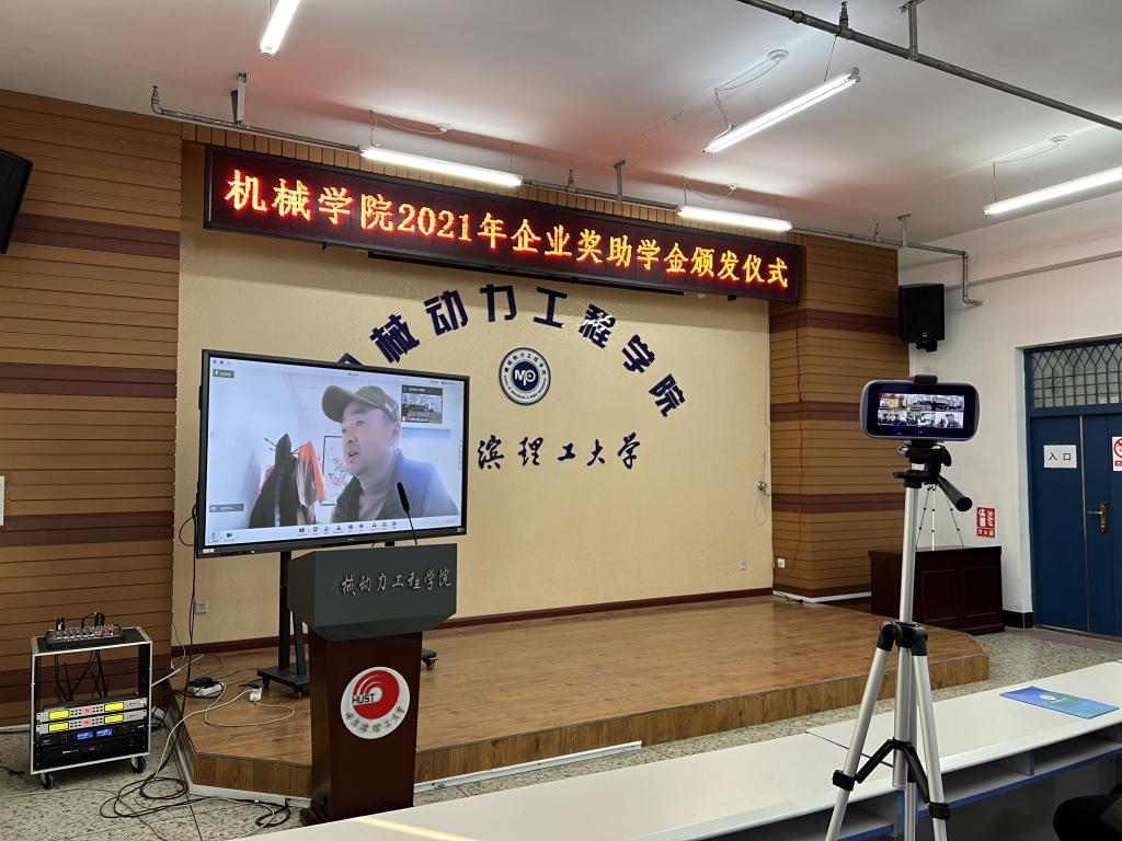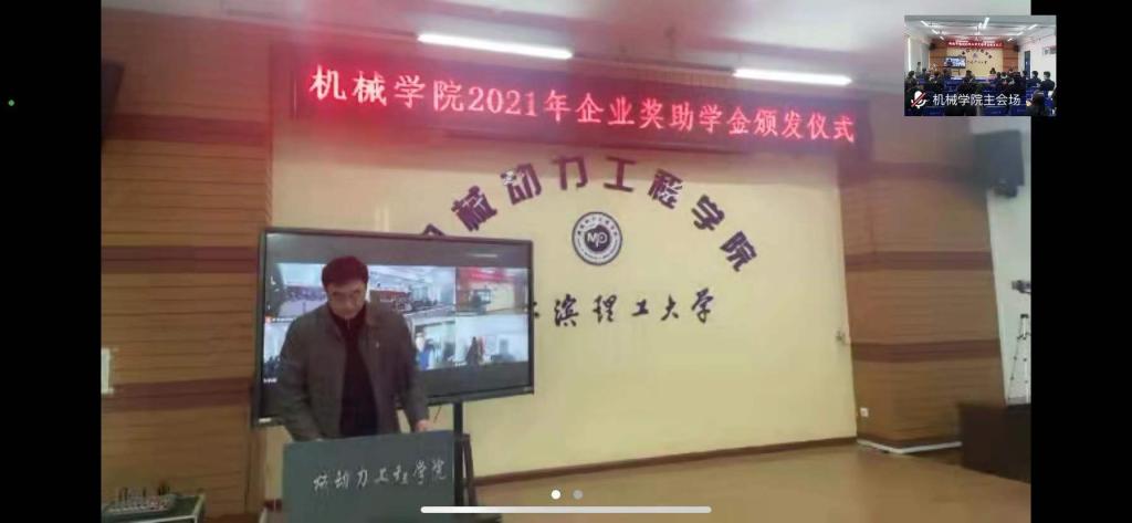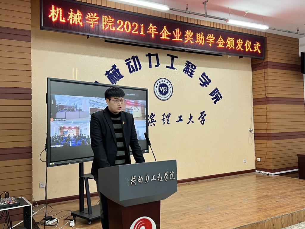 杨芳副书记宣读了获得本年度学院各项企业奖助学金的学生名单,线下参会学院领导共同为获得各奖助项目的学生代表现场颁发证书及奖助学金。机械19-7班学生杨伟东作为获奖学生代表发言,感谢学校对自己的栽培,感谢企业与校友对自己的关心和支持,将以此为契机,坚定人生目标,满怀感恩,勇往直前,利用自己所掌握的专业知识,在实践中施展才华,以更加优异的成绩回报社会,成为一名优秀的新时代青年,同时祝愿企业蒸蒸日上,学校蓬勃发展。