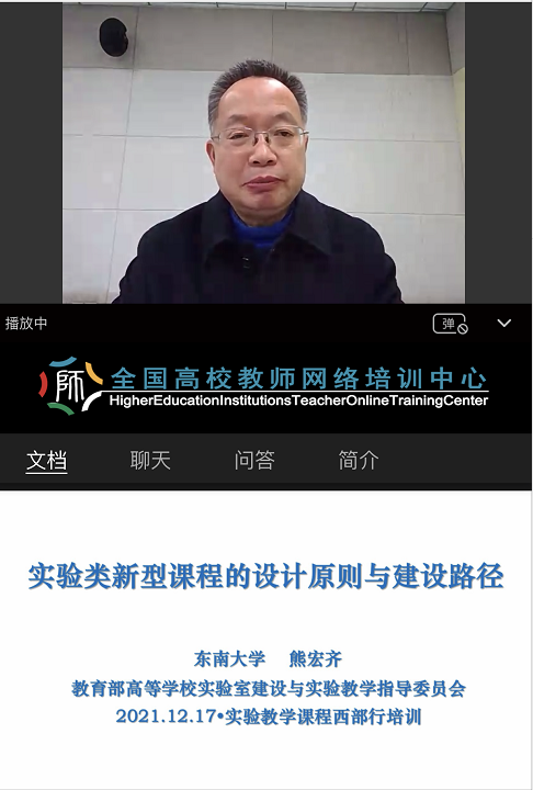 培训会采用线上直播的形式,共邀请了7位专家,从12月17日上午9点开始,至下午16点30分结束。会议围绕创新型实验教学课程的设计、虚拟现实技术与实验教学的融合、实验教学核心要素、培养学生终生发展力、实验类一流课程建设经验分享等内容展开。