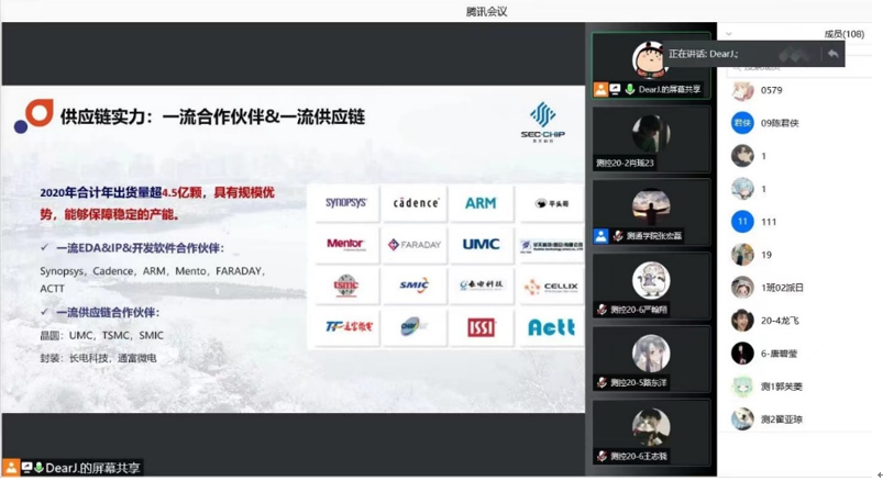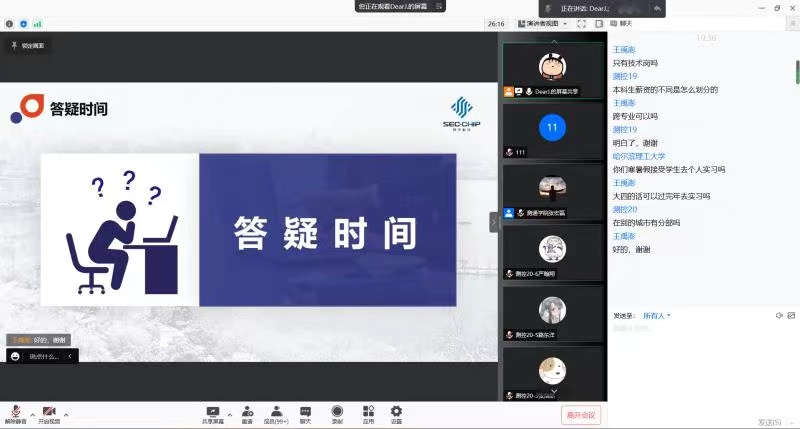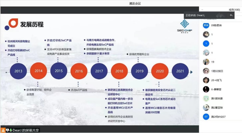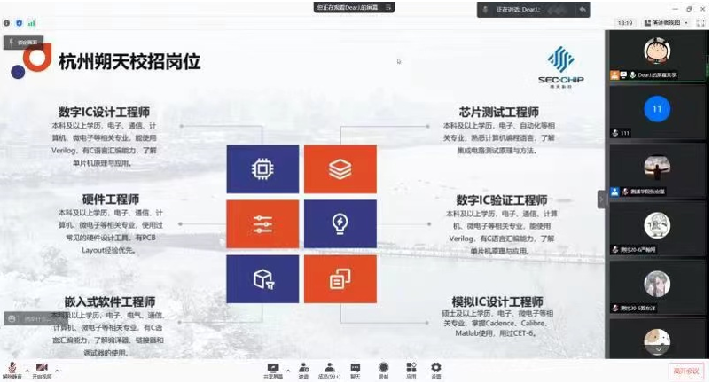 杭州朔天科技有限公司人事主管回菁婧女士重点宣讲了企业发展历程、产品优势、招聘岗位及要求,并对学生关心的问题进行了答疑。通过宣讲我们了解到杭州朔天科技有限公司坐落于美丽的杭州西子湖畔,是一家以产品为导向、研发为主体的国家重点集成电路企业,自创办以来,朔天陆续通过国家重点集成电路企业、国家高新技术企业、省级研发中心认定,并承担着国家重大专项研发任务。目前是国内唯一一家从打印机主控SoC芯片到全系列耗材芯片的设计公司。朔天是一家很有发展前景的企业,吸引了众多测通学子的目光,众多学生与企业人事主管建立联系,期待有机会加盟硕天科技共创未来。