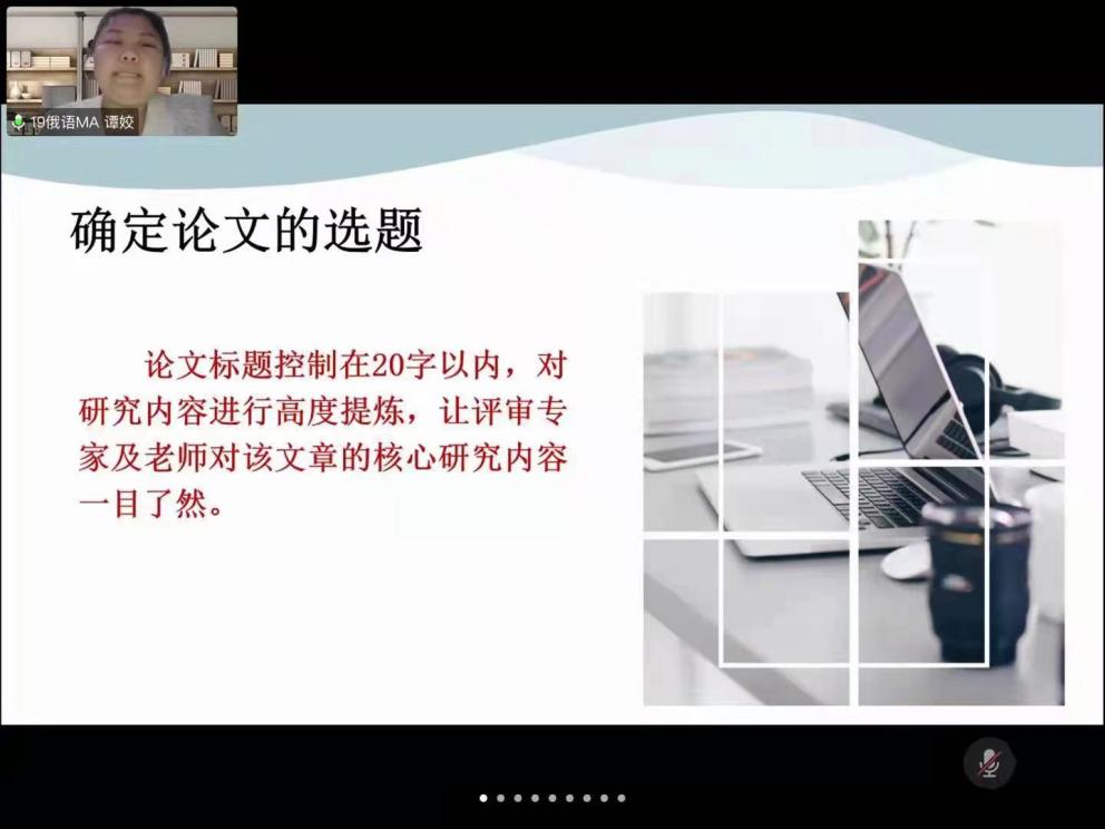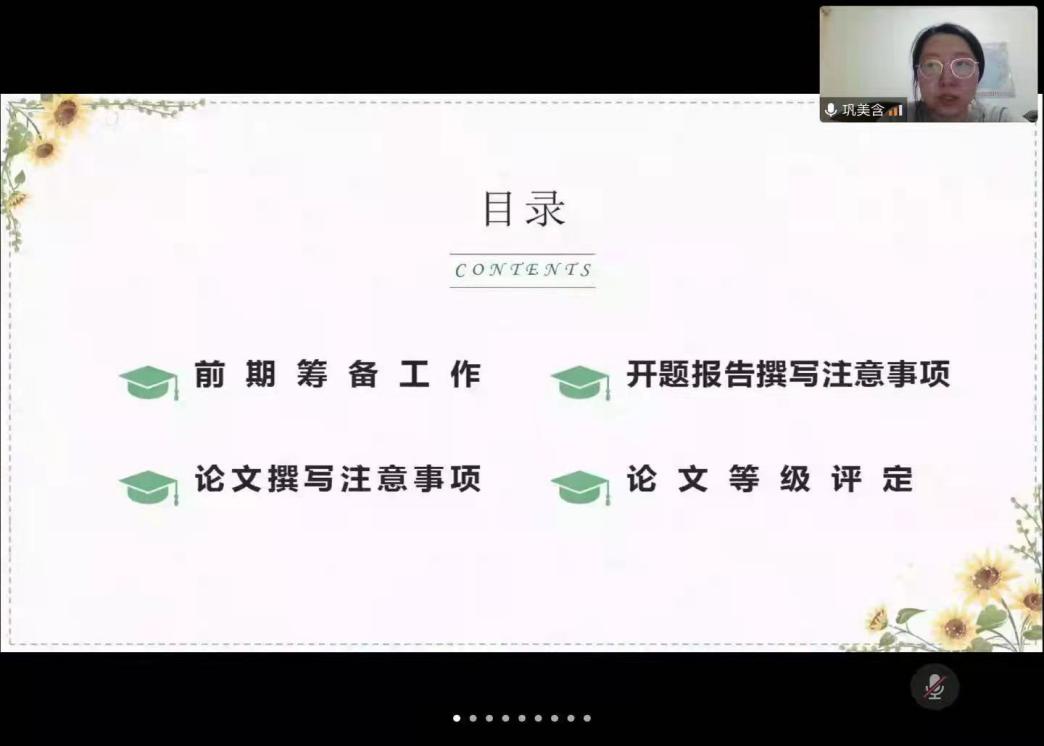 学院19级研究生巩美含、张洪宇、谭姣分别从自身论文研究方向、选题、框架的确定,论文的撰写过程等方面向同学们进行分享,并给参会同学们提供了建议:论文工作的顺利完成,离不开自身的不懈努力和导师的精心指导,整个过程要积极主动联系导师得到阶段性的专业指导;整个撰写过程要思路清晰,紧扣主题,注意研究方法的科学规范性,切记不要自己在论文中创造不规范的词汇和概念,引用内容必须有理有据;要从一开始就端正学术态度,避免投机取巧的侥幸心理,对于已完成的论文要在导师指导下仔细琢磨,反复修改,不经一番寒彻骨,哪得梅花扑鼻香。