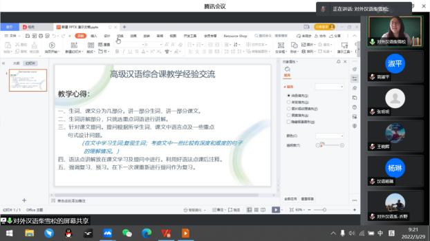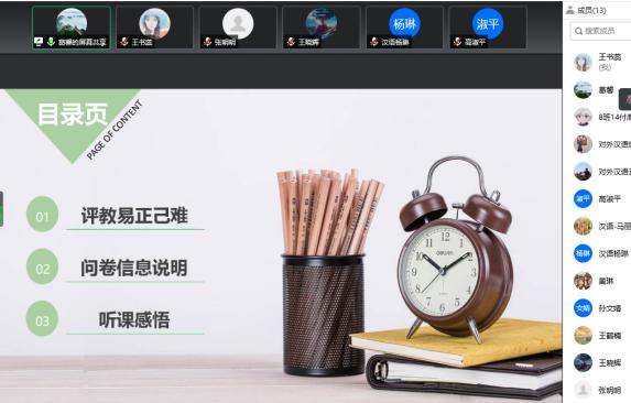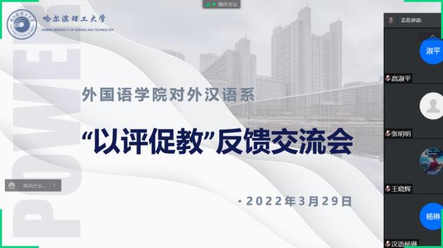 为提高留学生教学质量,及时反馈近期评教结果,分享课堂教学经验,3月29日上午对外汉语系举行“以评促教”线上反馈交流会,全体12位教师参会,教学副院长王书蕊应邀参加。