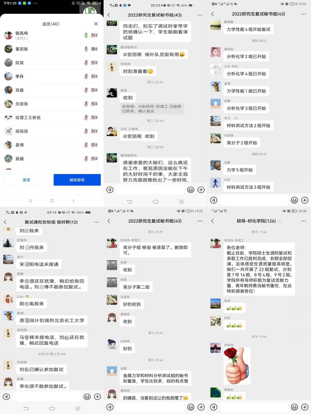 4月6日晚,学院各复试小组秘书工作到凌晨,将复试学生加入到复试钉钉群,完成复试前准备工作,4月7日早8:00,各复试小组开始复试。4月7-9日三天时间,学院密集组织开展了22组复试,其中7日16组,8日4组,9日2组。截止4月9日晚,学院招生计划指标已全部完成。在本年度研究生复试工作中,学院一百余名老师积极参与复试工作,青年教师主动承担复试小组秘书,学院老师团结一致、勇于奉献的精神得以充分体现。