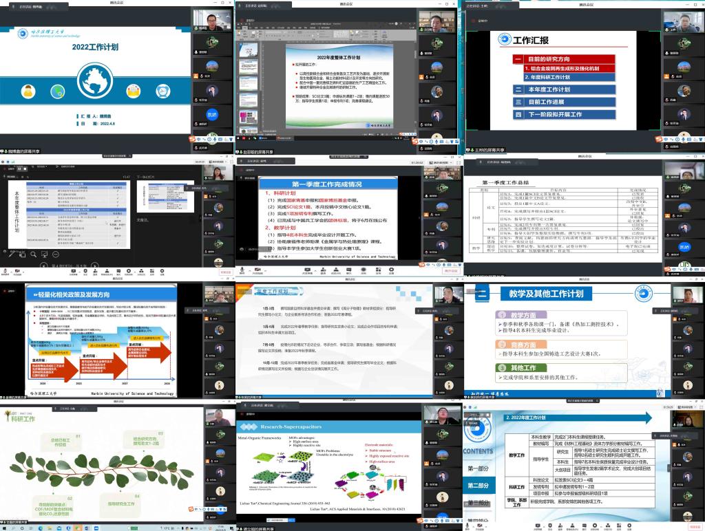 从8日下午13:30开始,历时6个多小时的时间里,学院46名青年教师结合自身情况,从立德树人、课程思政、一流课程、项目申报、高水平论文、专利申请、校企合作、学术交流、融入学院主流科研方向等方面,全面汇报了2022年度工作计划及目标、一季度工作进展及成果、下一阶段拟开展工作等。针对不同青年教师的汇报情况,学院领导及各方向带头人都给出了中肯的建议。对于部分青年教师提出的疫情期间的测试难、化学药品传取、学生实验监管等问题,现场沟通住校教师解决,助力疫情期间青年教师按计划进行工作。