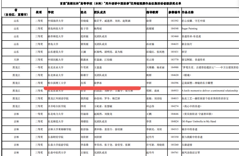 此次“用外语讲中国故事”优秀短视频作品征集活动校赛由校党委宣传部、校团委和教务处主办,外国语学院承办,主题为“我和我眼中的非遗”。参赛短视频内容围绕多彩非遗、匠人匠心和地域非遗展开。校赛阶段共收到来自全校百余名本科生的参赛作品41部,覆盖4个语种。李妍老师,张春烨老师指导的学生作品入围省赛。外国语学院大外一部李妍老师指导的由21级法学专业学生丛郑、徐梦冰共同创作的《辽南面塑:神秘的东方雕塑》在省赛中获得二等奖。此次大赛共有来自全国28个省的184所高校作品分别入围省赛,获奖选手的作品将在高等教育出版社相关网站和平台上进行展示。