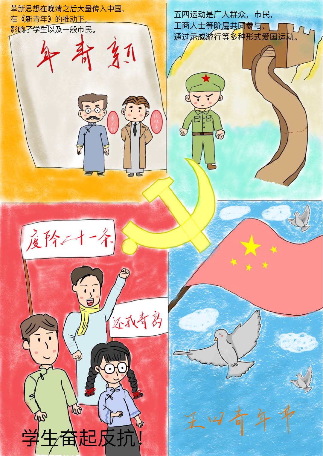 今年是共青团成立100周年,为继承和发扬五四运动光荣传统,引导广大团员青年以求真务实、开拓创新的精神,进一步解放思想、更新观念、立足本身、扎实学业,增强团的凝聚力,培养团队精神,建筑工程学院团委以“庆祝中国共产主义青年团成立100周年”为主题,坚持以人民为中心,用明德引领风尚,开展学习“团史”故事漫画大赛。本次活动旨在庆祝建团一百周年,学习共青团精神,抒发永利官网广大团员青年的爱国主义情怀,提高广大团员青年的创新手绘能力。