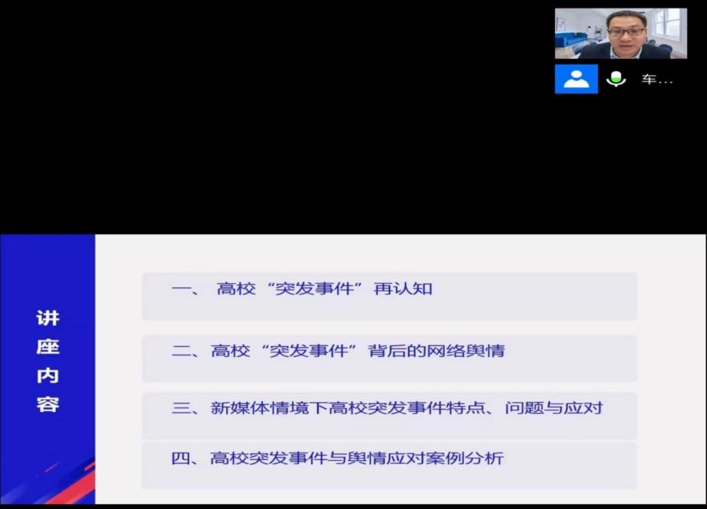 培训第一讲,车志远以《高校校园突发事件与舆情应对》为题作了专题培训。围绕高校“突发事件”再认知、高校“突发事件”背后的网络舆情、新媒体情境下高校突发事件问题与应对、高校突发事件与舆情应对案例分析等四个方面深入探讨了突发事件根源与有效应对策略。