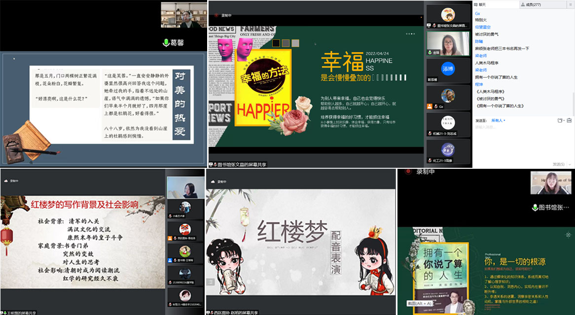 系列活动(二):举办的线上读书分享会,其中有永利官网外国语学院葛馨教授主讲的《秋园:微小的个人所呈现的鲜活历史》,黑龙江大学信息管理学院王明慧副教授主讲的《<红楼梦>——关于青春的挽歌》,永利官网图书馆馆员张文晶、金瑛主讲的《疫”路心防——积极心态调节书单分享》