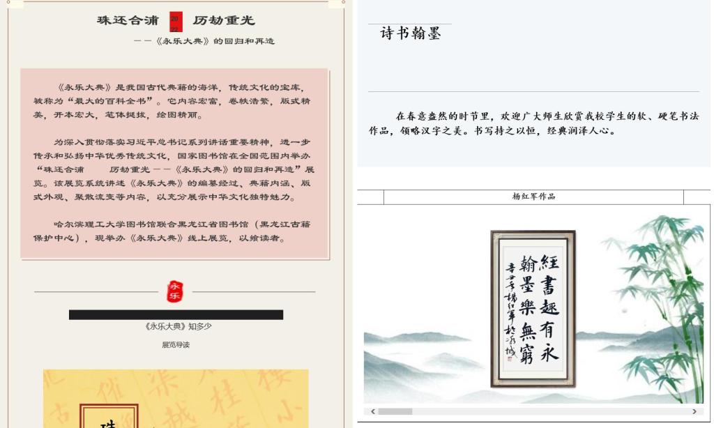 系列活动(二):举办的《珠还合浦历劫重光—<永乐大典>的回归和再造》和《“诗书翰墨”书法作品展》线上展览会
