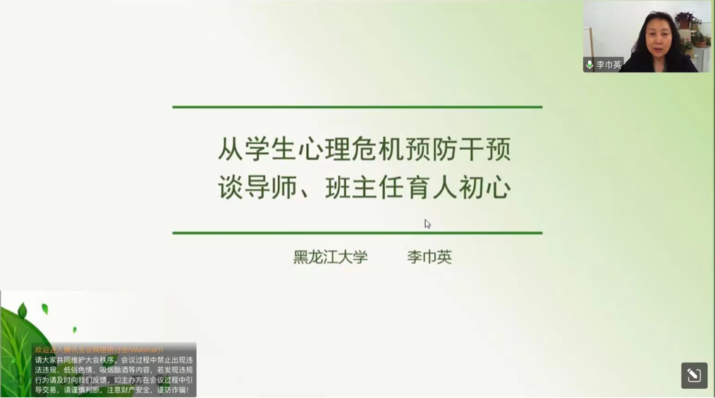 为进一步加强永利官网心理健康教育工作,全面构建校内协同育人机制,强化学生心理健康教育的全员参与意识,永利官网于4月29日18时举办主题为“从学生心理危机预防干预谈导师、班主任育人初心”培训会,培训通过腾讯会议平台线上进行。培训会邀请黑龙江大学学生工作处副处长、心理咨询中心主任、黑龙江省高校心理健康教育专家委员会秘书长李巾英教授作为主讲嘉宾。党委学生工作部班子成员、各学院研究生导师、班主任、学生工作副书记、辅导员参加培训,培训由党委学生工作部部长戴湘竹主持。