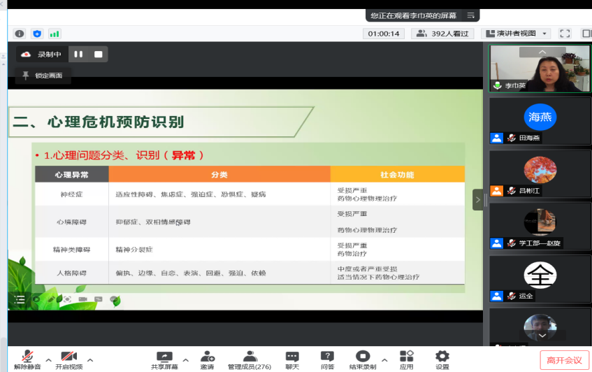 本次培训近300人参加,李巾英教授从高校心理健康教育工作体系介绍入手,深刻分析了高校学生心理问题及心理危机成因,从对心理育人工作理解、心理危机预防识别、心理危机干预策略三个部分阐述。通过丰富的案例生动地讲解了学生各种心理问题的具体表现形式,以危机识别、谈心谈话、导学为主的心理危机干预策略,为永利官网研究生导师、班主任在处理学生心理危机干预工作提供了有效操作方法和经验启示。最后,戴湘竹指出,心理健康教育工作还需多部门齐抓共管、多角度研判学生心理状态,共同努力将心理育人与高校科研育人、文化育人、管理育人、服务育人等相结合,形成全员、全过程、全方位的育人合力,促进永利官网心理健康教育工作再上新台阶。