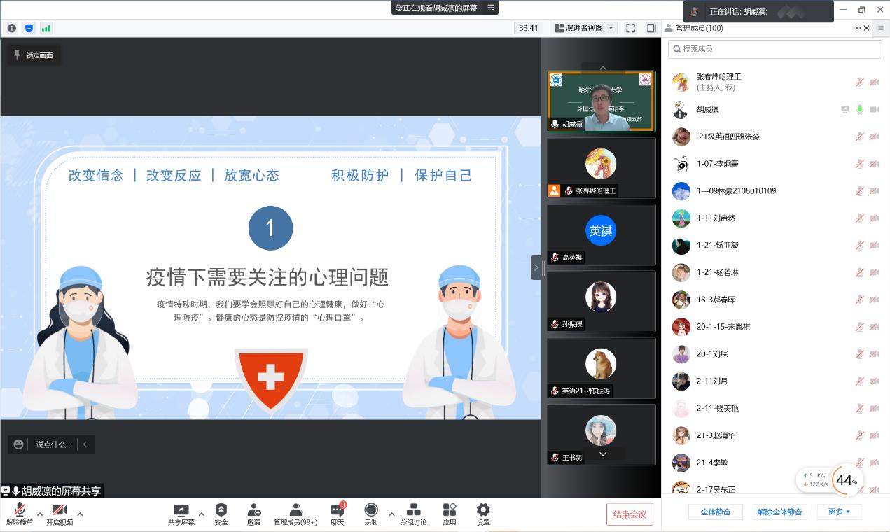 为了提高师生疫情下的心理素质,保障师生身心健康,真正培养“德智双全,身心健康”的有为青年。2022年5月6日,在外国语学院党委的领导下,英语系党支部通过网络平台,邀请了高校心理咨询中心兼职心理咨询师、吉林市经济广播电台特邀心理专家、吉林市第六人民医院客座心理咨询师、《小崔不抑郁》特邀专栏作者胡威凛老师,为英语专业师生开展了一次以“春暖花开,‘慰’你而来”疫情期间专题心理健康讲座。