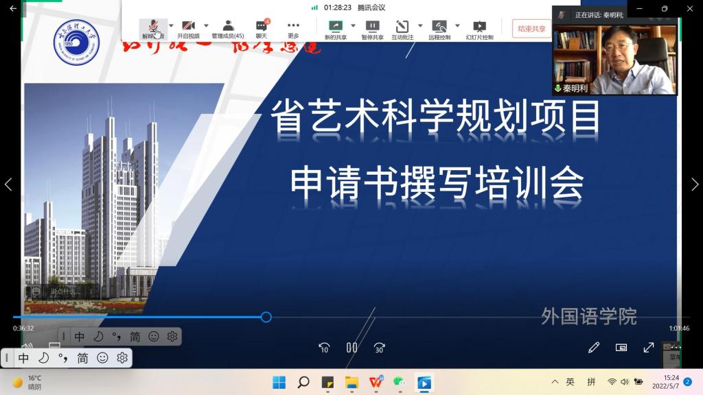 5月7日下午,外国语学院举办黑龙江省艺术科学规划项目申请书撰写培训会。大连理工大学秦明利教授受邀就申请书撰写作辅导讲座,外国语学院院长马艳辉、副院长杨蕊,参与此次申报的40多名教师线上参会学习。副院长杨蕊主持培训会。