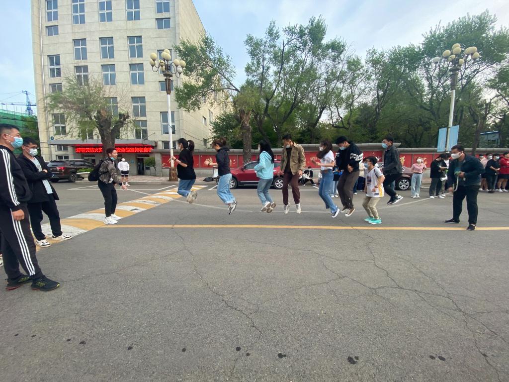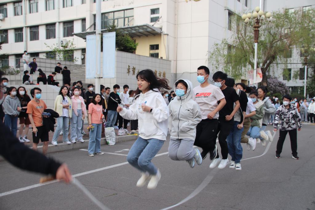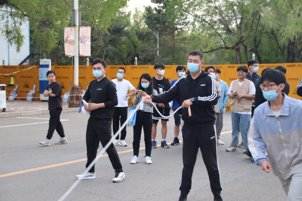 第二场活动由团体跳绳和趣味大接力两个项目组成。团体跳绳最考验团队的配合,在比赛前,各支队伍都利用空闲时间进行了练习,教学楼前、体育场上,随处可见认真训练的身影,辛苦的付出为的就是能在赛上为班级和团队取得好成绩。赛场上,队员们矫健的身姿穿梭绳间。他们跳跃轻盈欢快,摇绳掷地有声,呐喊整齐嘹亮,笑声和汗水一同挥洒。虽然不少同学没有接触过团体跳绳项目,甚至面对大绳有些胆怯,但有伙伴们的冲锋在前,也渐渐克服了障碍,找到技巧并配合默契。面对着儿时熟悉的游乐项目,老师们也都参与其中,给同学们传授技巧。研究生们更是用实力教会师弟师妹谁才是“王者”。