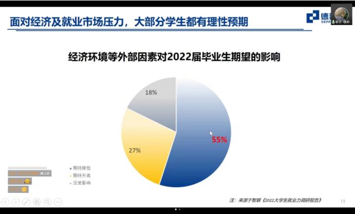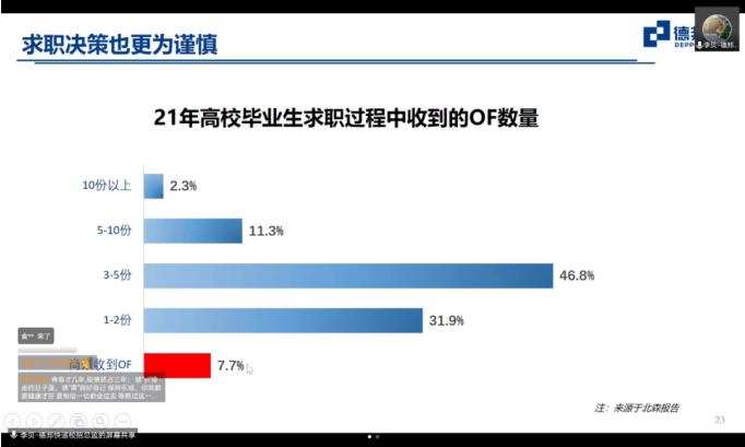 本次讲座主要分为两大部分,第一部分是就业市场洞察。在这一部分中,李贝通过就业市场基本盘、就业去向、就业期待、就业心态与行为四小节进行了详细介绍,正确引导我们该如何去选择自己的就业去向,更大概率获得就职机会。
