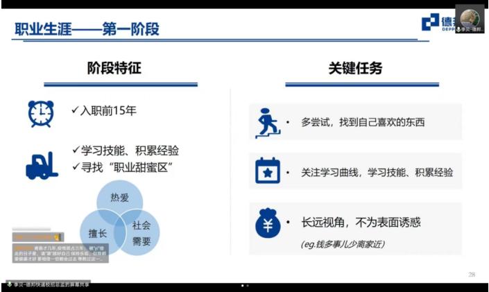 第二部分为职业生涯规划。在这一部分中,李贝首先通过哈弗追踪研究和车日路模型两个案例向我们强调目标对人生有巨大的导向性作用,然后从职业生涯的三个阶段,理解职业生涯规划的概念,如何做职业生涯规划三方面做了详细讲解,有助于帮助我们正确设定自己的职业发展目标,并制定行动计划,使自己的才能得到充分发挥,以实现职业发展目标。