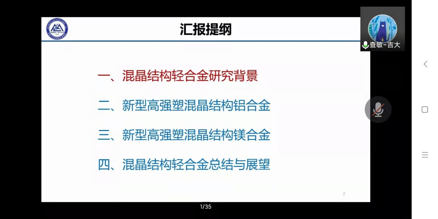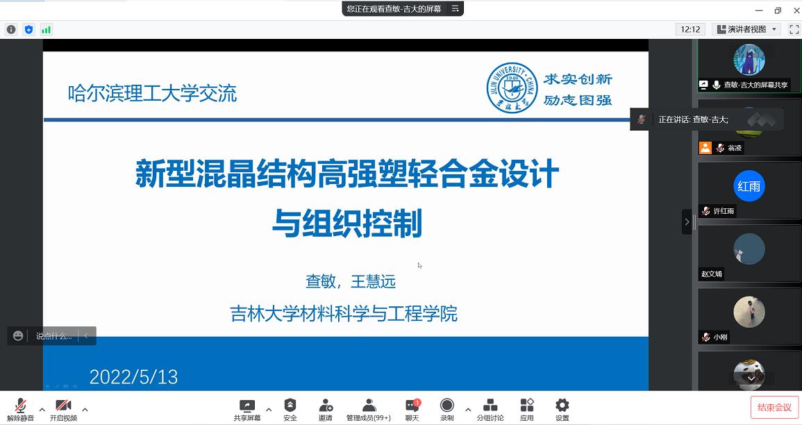 为活跃学院学术氛围,拓展师生的学术视野,材化学院筹划了“材化大讲堂”系列学术讲座活动。第二期讲座于2022年5月13日下午进行,邀请了吉林大学材料科学与工程学院博士生导师查敏教授作了题为“新型高强塑混晶结构轻合金设计与组织控制”的学术报告。讲座采用腾讯会议的形式进行,材化学院及其它院校师生共计175人参加了此次讲座,讲座由翁凌副院长主持。